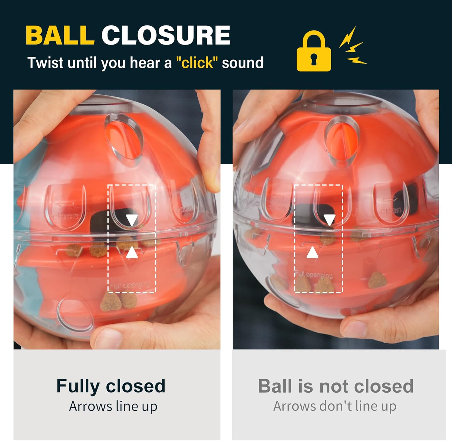 - EASY TO LOAD: 1: Twist the lid counterclockwise to open; 2: Pour in food or treats and adjust the dispensing opening to desired size; 3: Twist tighthen the lid until it clicks