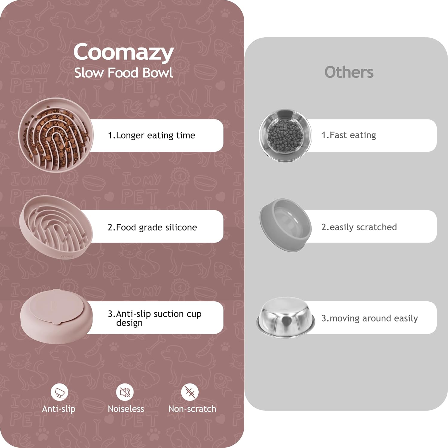 - Crafted from food-safe silicone, these bowls are heat-insulating, high-temperature resistant, anti-slip, waterproof, and durable against tears and bites. Free from BPA, PVC, phthalates, and lead, the soft material ensures your pet's teeth remain unscathed.