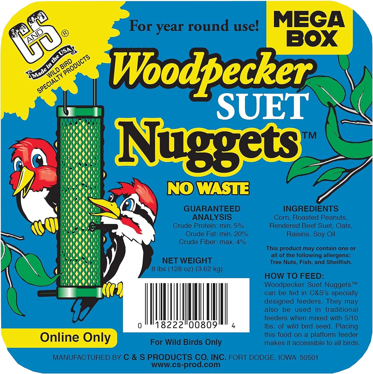 - ECONOMICAL AND EASY TO USE compared to traditional seeds. C&S Woodpecker Suet Nuggets combined with a wire feeder offer a great value for today’s wild bird feeding customer.