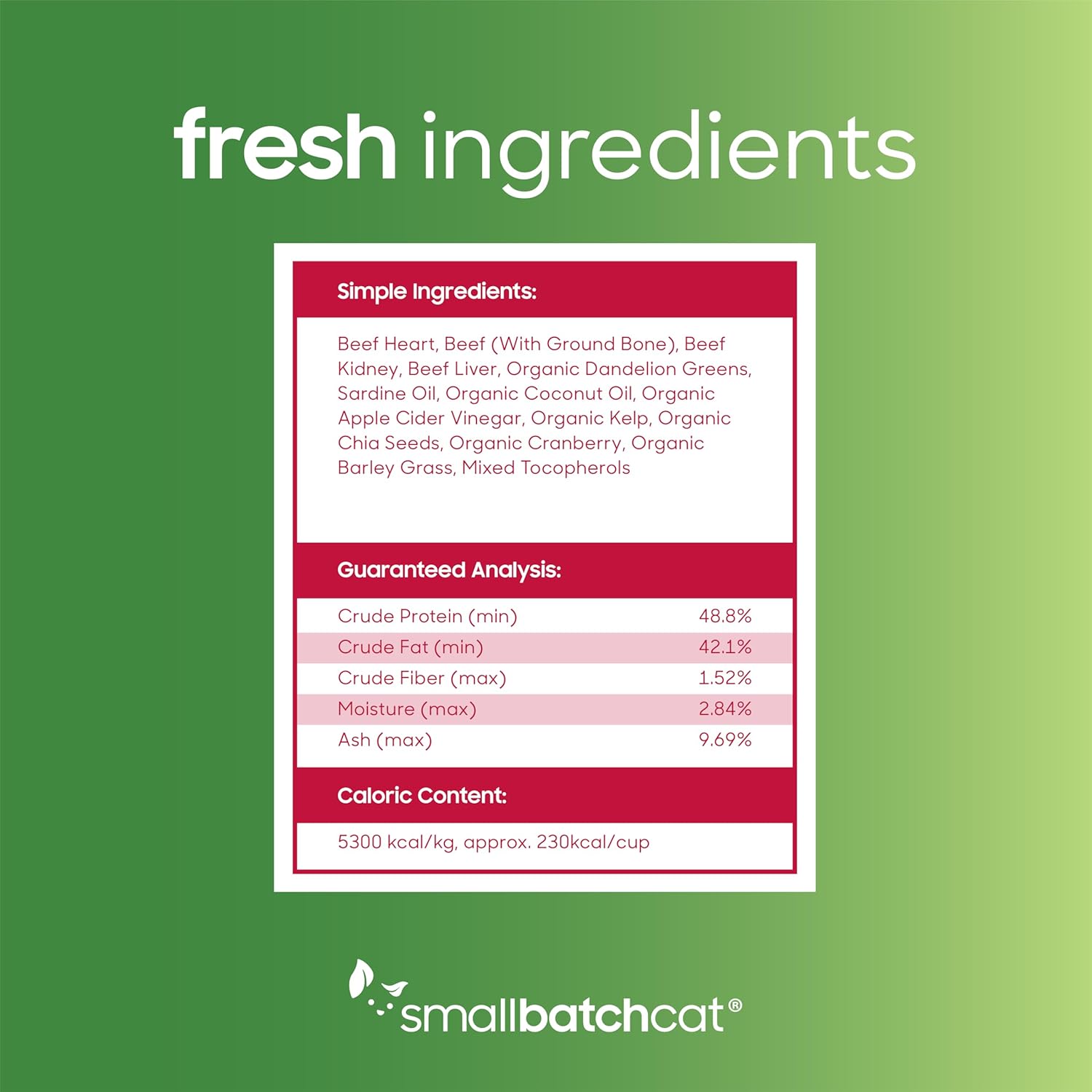 - Pure, Thoughtfully Sourced Ingredients: Non-GMO, pesticide-free produce paired with humanely raised and harvested beef; no mechanically separated meat included in this freeze dried cat food.