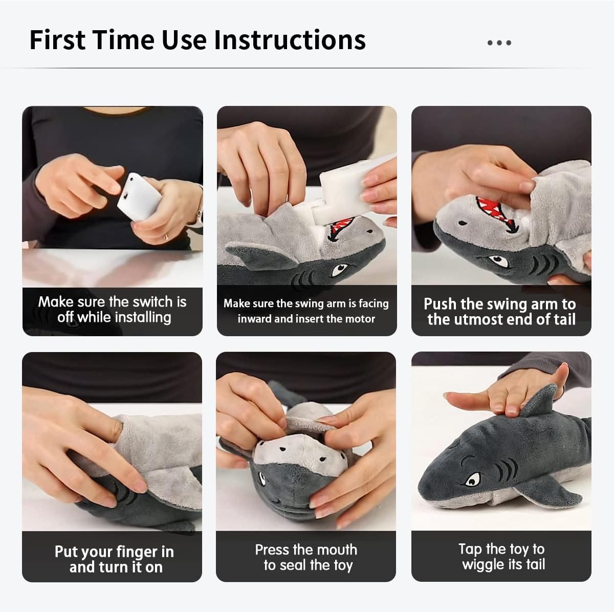 - 【Easy to Use】To ensure ease of use, ensure the switch is off and facing the shark's belly during installation. Push the electric motor to the far end of the tail and press the mouth to seal the toy. Finally, turn on the switch and tap the toy to make its tail wiggle