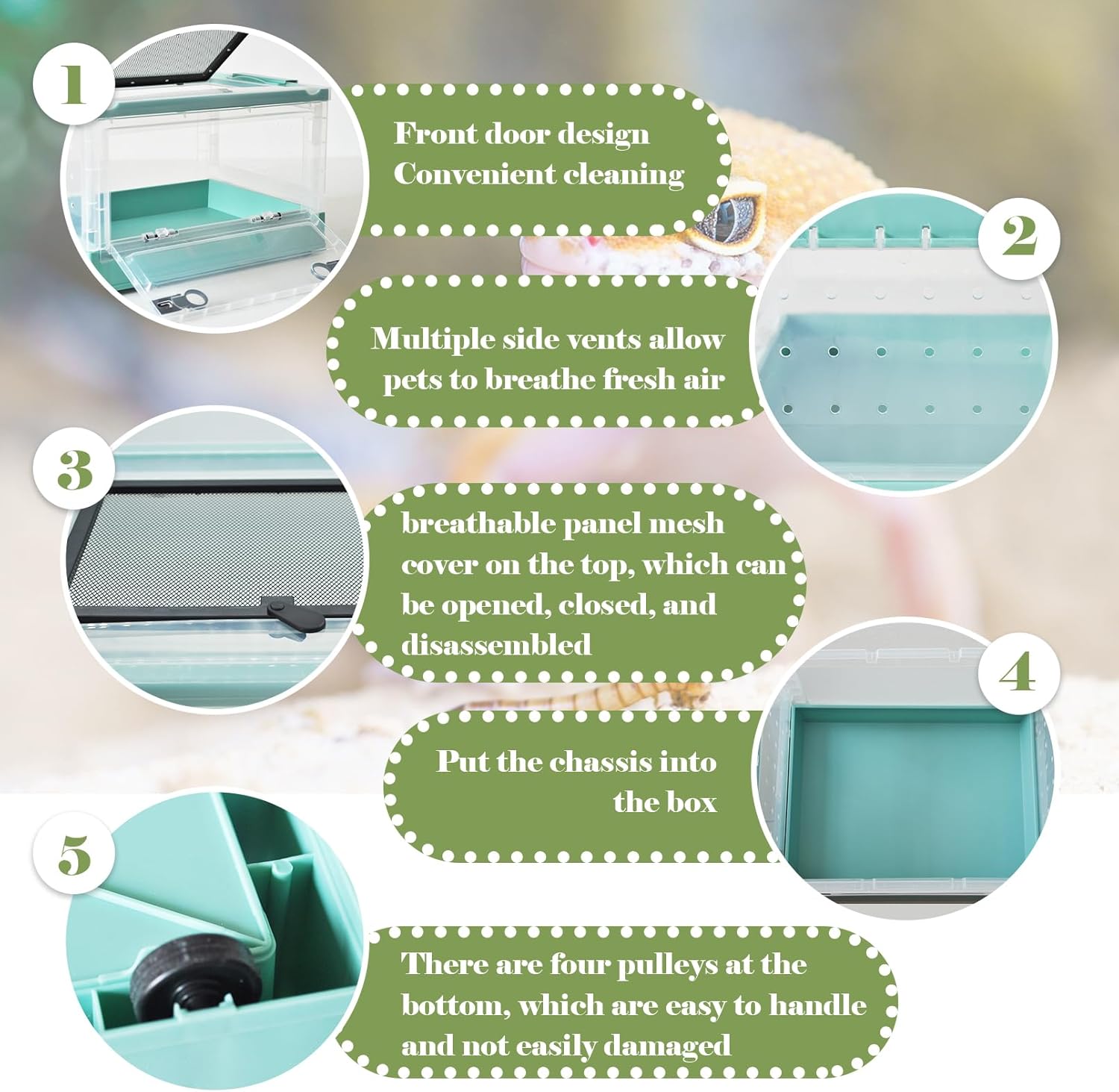- Clever Design:Portable small snake terrarium is designed with multiple small air holes for ventilation there is a breathable panel mesh cover on the top,can be opened,closed,and disassembled,ventilation and breathability,ensuring air circulation in the internal habitat,multiple vents at the bottom and sides allowing pets to breathe fresh air. front panel can be opened or closed,convenient cleaning of pet houses,four rolling pulleys at the bottom,carrying out, and not easily broken