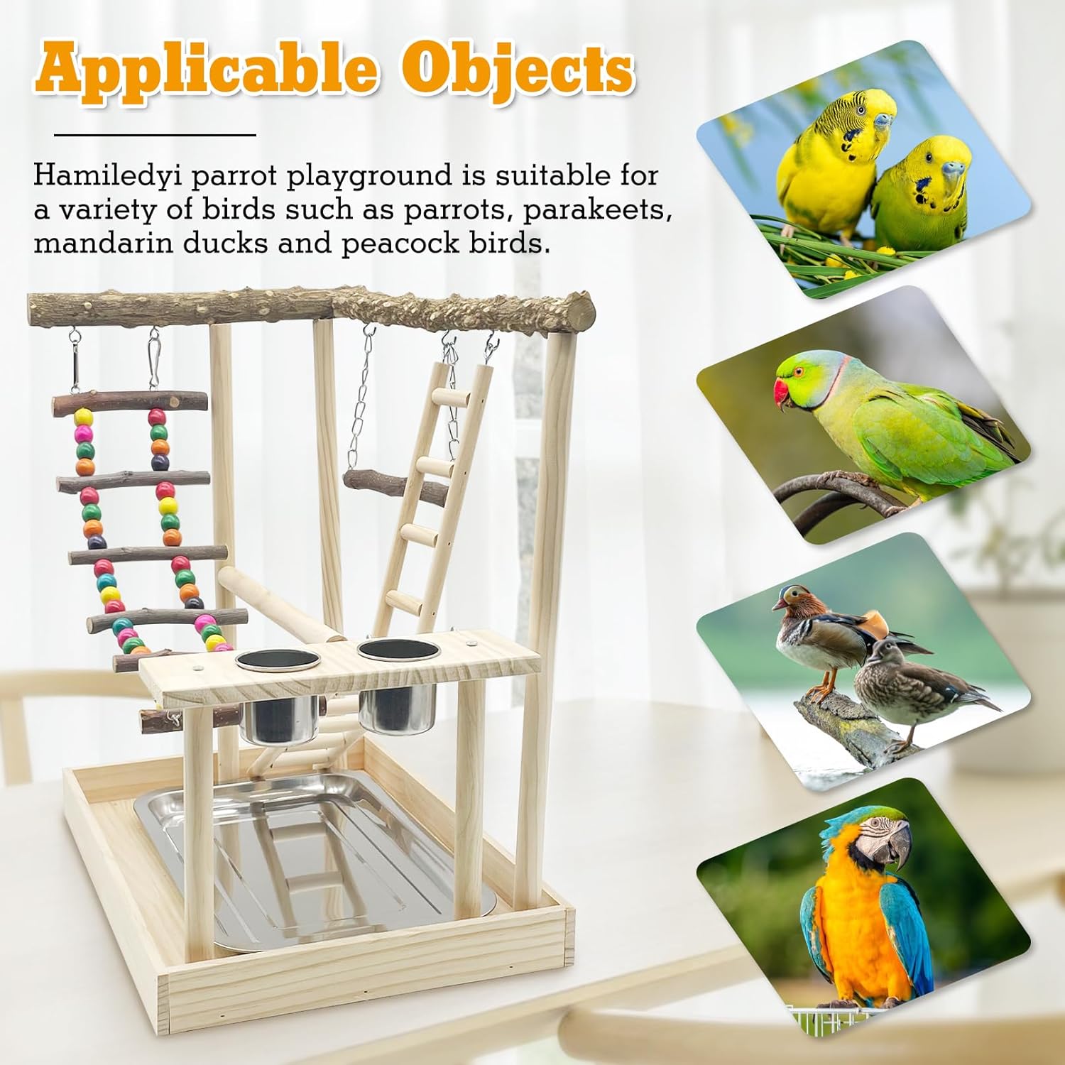 Hamiledyi Bird Playground Parrots Wood Perch Stand Cockatiel Playground Bird Play Gym Colours Climb Ladders Swing Chewing Toys with Parakeet Feeding Cups Exercise Activity Center for Lovebirds Conure