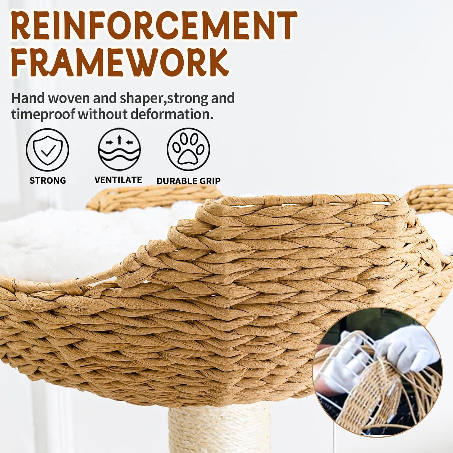 - Natural Materials. This modern cat tree is made of E1 board, water hyacinth grass, and natural sisal rope. Compared to traditional cat climbing frame designs, the use of pure natural plant - gourd grass as the raw material for weaving cat baskets makes them more wear-resistant and odorless. Each cat scratching post of the cat tower is wrapped and covered with natural sisal rope, which is timeproof and satisfying the cat's paw grinding pleasure.