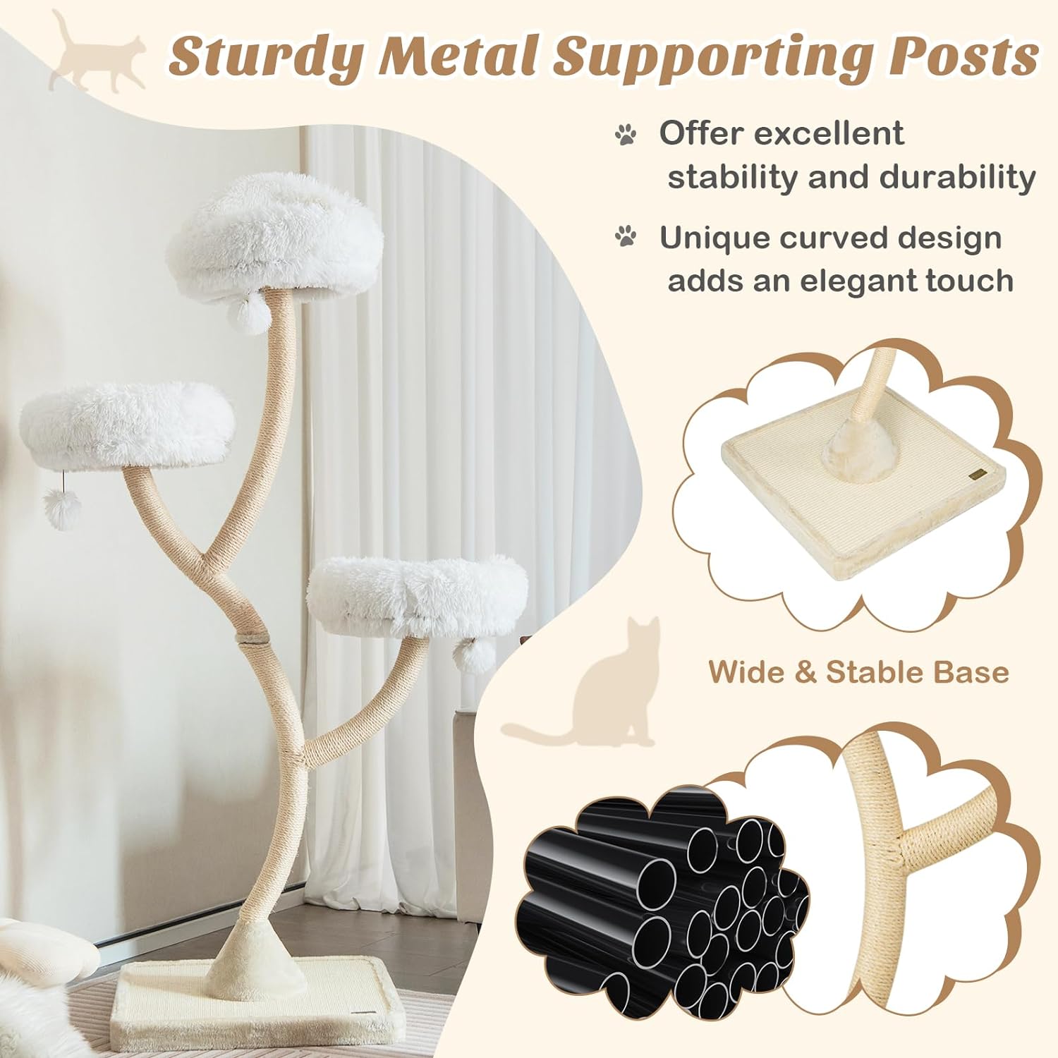 - [Designed for Large Cats]: Each cozy perch can support up to 22 lbs, boasting a sturdy base crafted from premium engineered wood for ample support. And its surface is covered with durable natural sisal for added space for cats to scratch. The posts are made from iron pipes and wrapped by resistant sisal. Your cat will undoubtedly feel secure and steady atop this structure, much like the reassurance Grace experiences while using this modern cat tree.
