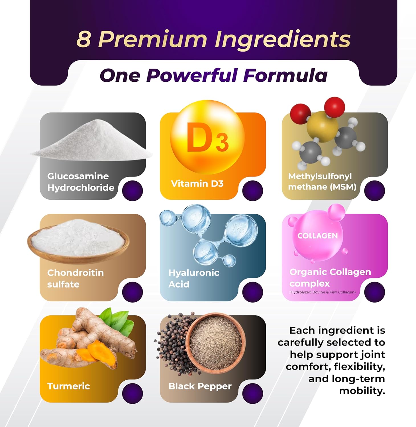 - Unrivaled Formula: GriMed Glucosamine presents a unique combination of 8 precious herbs neatly packed into every capsule. These ingredients encompass Vitamin D3, Glucosamine Hydrochloride, Methylsulfonylmethane, Chondroitin, Hyaluronic Acid, Organic Collagen complex, Turmeric, and Black Pepper. This special blend significantly elevates your overall well-being. No need to manage various supplements anymore – a single daily Grimed Glucosamine capsule delivers remarkable outcomes.