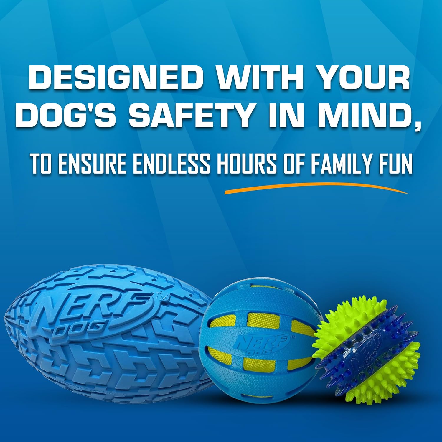 Nerf Dog Toy Gift Set, 3-Piece Set of Outdoor Dog Toys for Fetch, Includes Checker Crunch Ball, Spike LED Squeak Ball and Tire Squeak Football