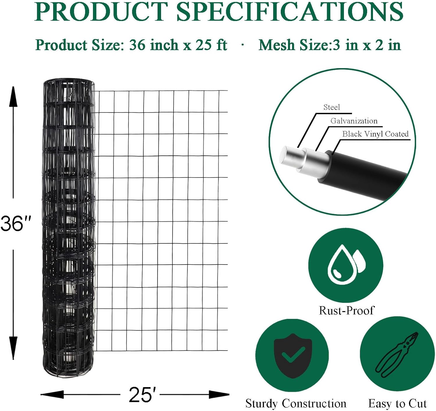 - The inner wire diameter is 16 gauge (1.5mm), after vinyl coating 1.9mm. Mesh size 2"x3". Measures 36 inches in height and 25 feet in length. Black color.