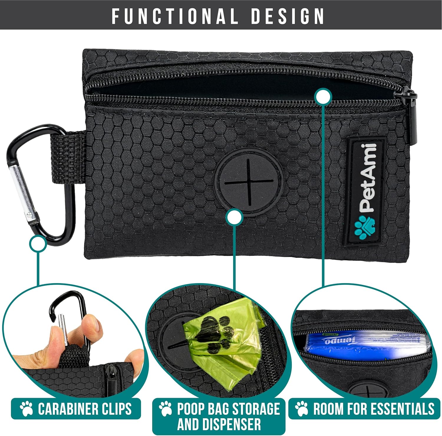 PetAmi Dog Poop Bag Holder for Leash, Dog Poop Bag Dispenser with Clip, Dog Waste Bag Holder for Pet, Dog Treat Pouch, Doggy Walking Camping Accessories with Trash Bag Roll, Black 1 Pack