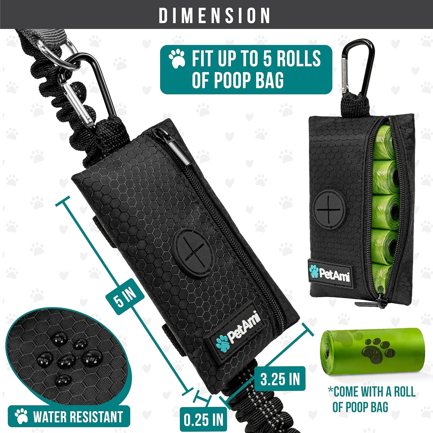 - BLACK DOG WALKING BAG: PetAmi poop bag holder dispenser includes one roll of dog poop bags, measures 5 x .25 x 3.25 inches, and is made of durable oxford polyester. Doggy trash bag carrier is refillable and is compatible with most dog poop bag rolls. This pet travel bag is a great gift for dog mom, dad, parents, owners, and trainers. Comes in multiple colors to mix and match your dog leashes.
