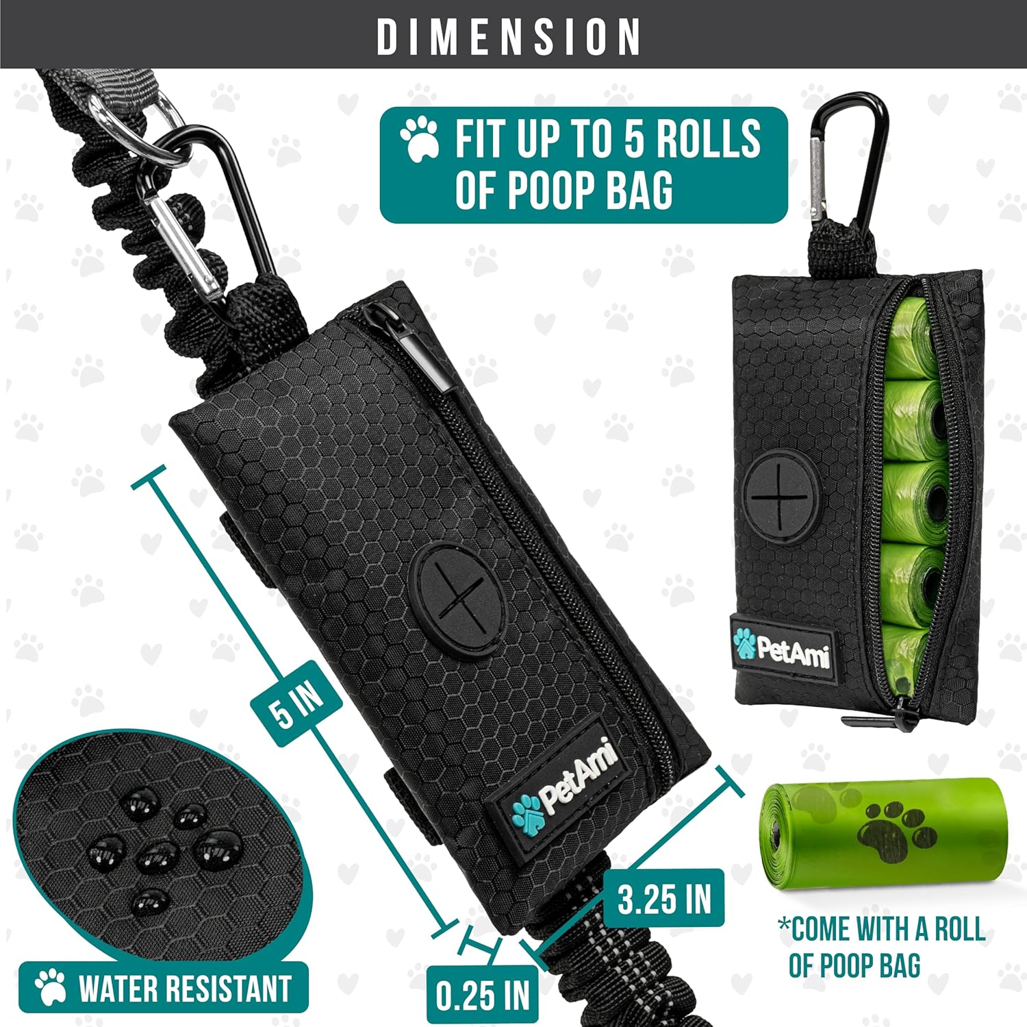 - DOG POOP BAG HOLDER: Pet dog poop bag dispenser carrier measures 5 x 0.25 x 3.25 inches and includes 1 roll of dog poop bags. Soft fabric dog bag holder dispenses waste bags and comes with a carabiner clip, zipper pocket, and velcro straps. Ideal for puppy, pet, dog walking bag for daily walks, jogging, camping, hiking, and travel.