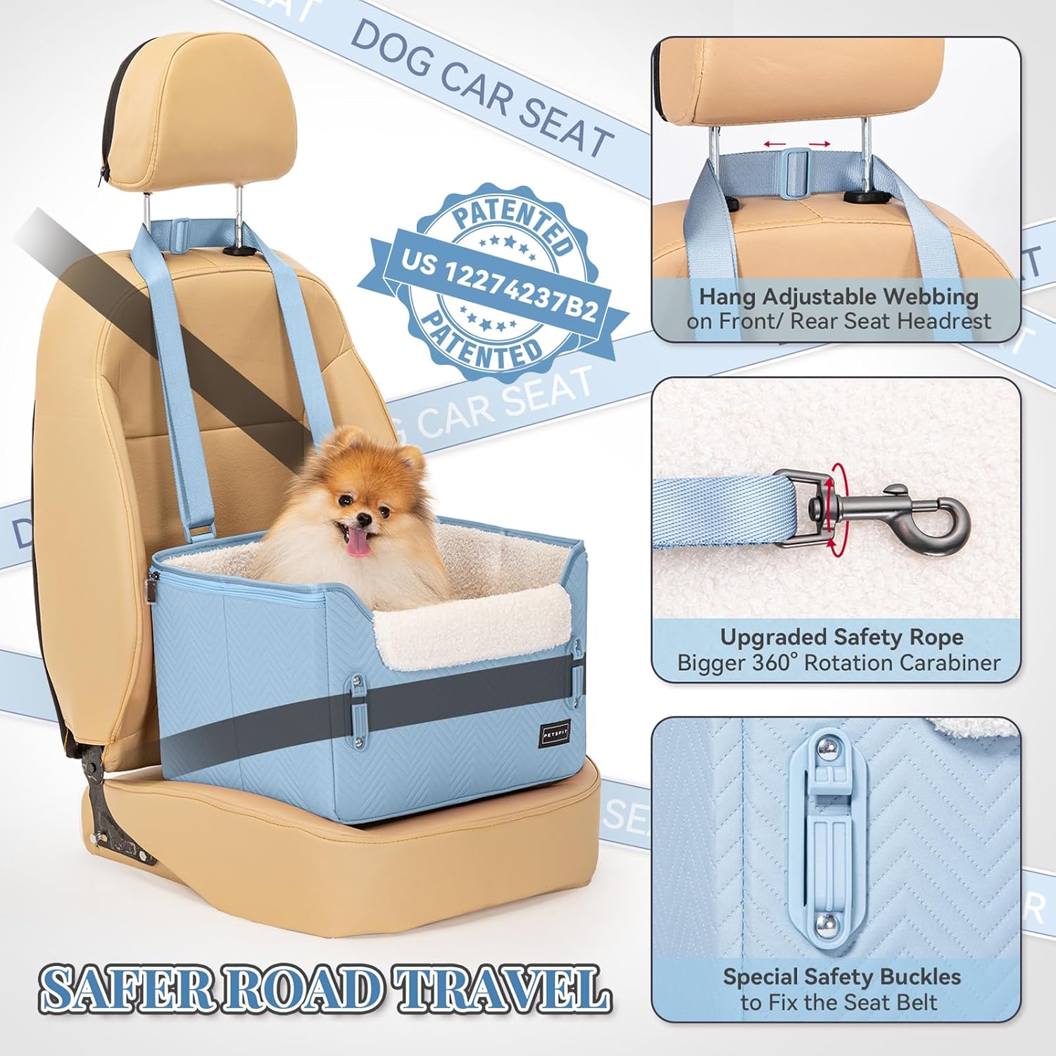 - [Safety First] The dog car seats for small dogs offer your little one to stay comfortable and secure without disturbing you when you driving. The adjustable clip-on leash is hidden under the removable booster cushion, it hooks the dog's harness to avoid the pet from jumping out. Patented buckles provide more stable security for your travel.