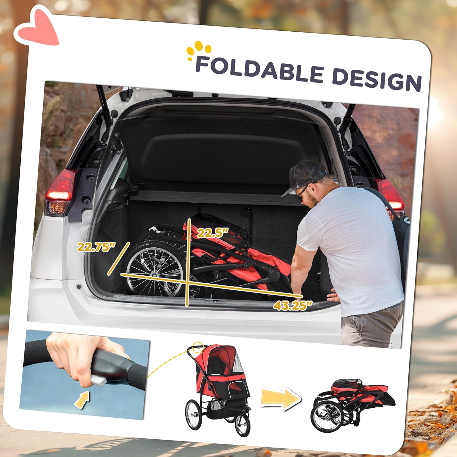 PawHut 3 Wheels Pet Stroller for Small and Medium Dogs, Foldable Cat Stroller Jogger with Adjustable Canopy, Safety Tether, Cushion, Storage Basket, Red