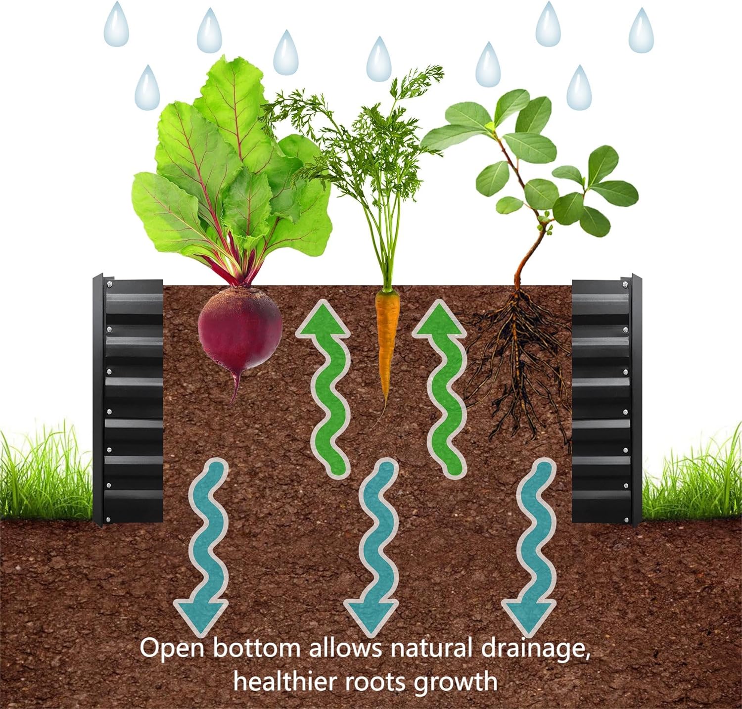 - OPEN BOTTOM: Sits on the ground garden bed, allows natural drainage, prevent waterlogging and root rot. It encourages the plants’ roots to grow deep into the ground, promoting stronger and healthier plants.