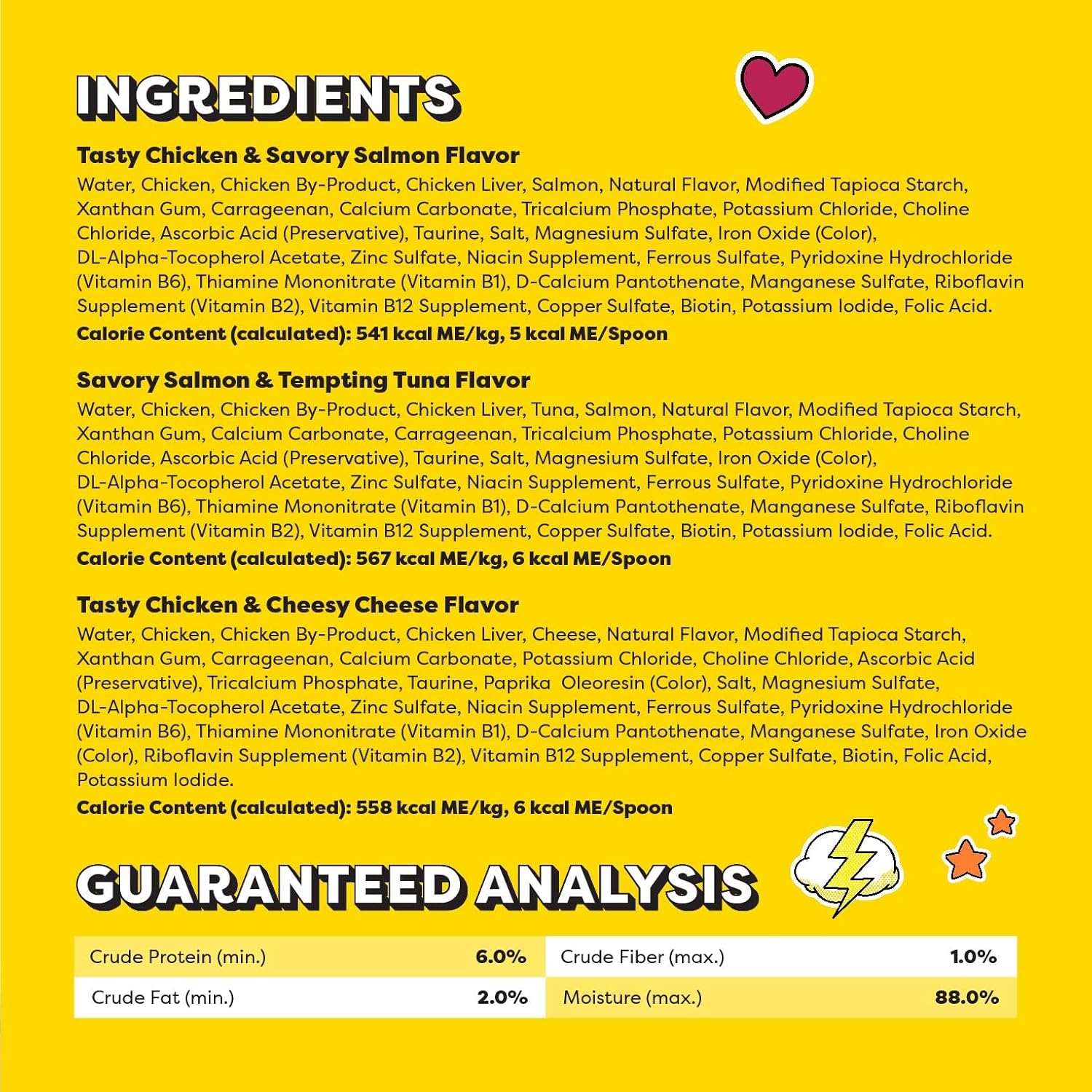 - Made with real chicken, tuna, salmon or cheese so your favorite feline will enjoy two irresistible flavors in one lickable spoon