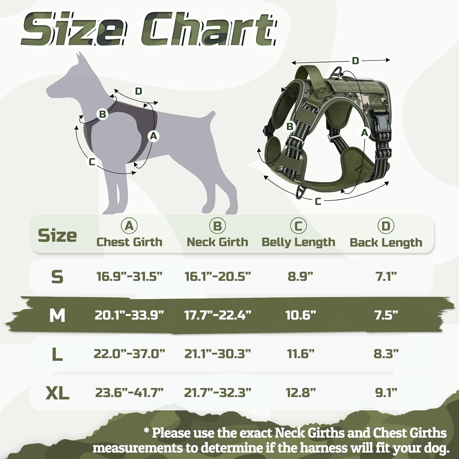 - Medium Tactical Dog Harness: Chest Girth: 20.1"-33.9" (51-86cm), Neck Girth: 17.7"-22.4" (45-57cm), Belly Length: 10.6" (27cm), Back Length: 7.5" (19cm). Ideal for Pitpull, Boxer, Cane Corso, Labradoodle, Australian Shepherd, Corgi, Bull Terrier, Cairn Terrier, etc