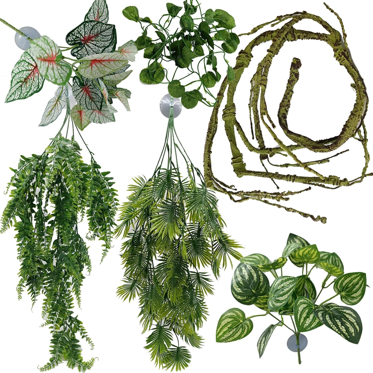 - 【Include】2 x Large Plastic Hanging Leaves vines, 1 x Flexible Bendable Reptile vine branch of 47 inch / 120cm in length, 1 x vine leaves decor, 2 x mini Hanging Ivy Plants of 12 inch / 31cm in length, 6 x large/strong suction cups of 2 inch / 5cm in Dia. Perfect for reptile habitat decorations, terrarium hanging, snake terrarium decorations.