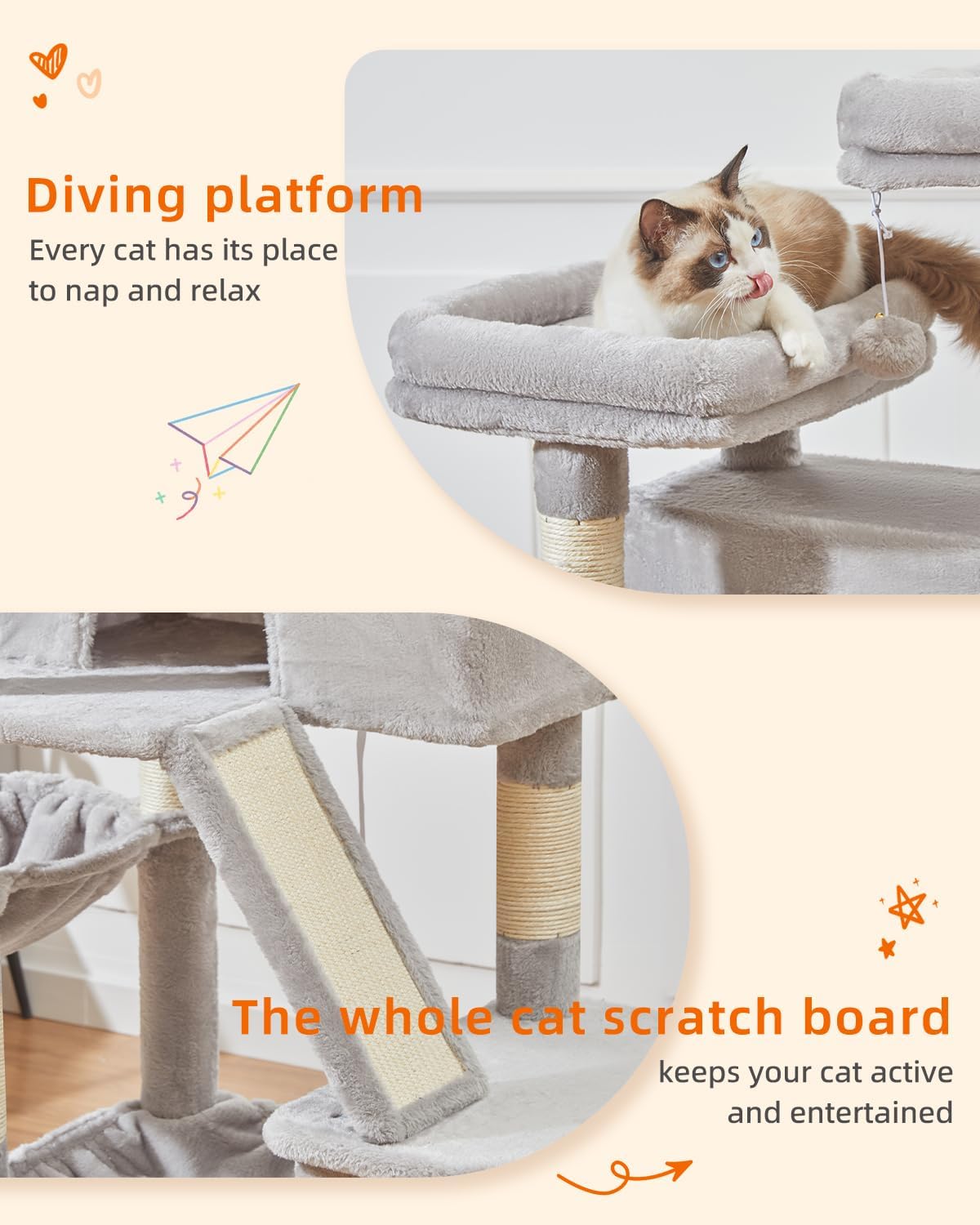 - 1.All-in-one design: There are 5 floors with 2 soft tops, 1 spacious cat apartment, 1 sisal ramp, 1 hammock and 1 hanging basket, natural sisal scratching posts and skin-friendly plush, and a multi-functional cat tree that attracts cats to play and rest.