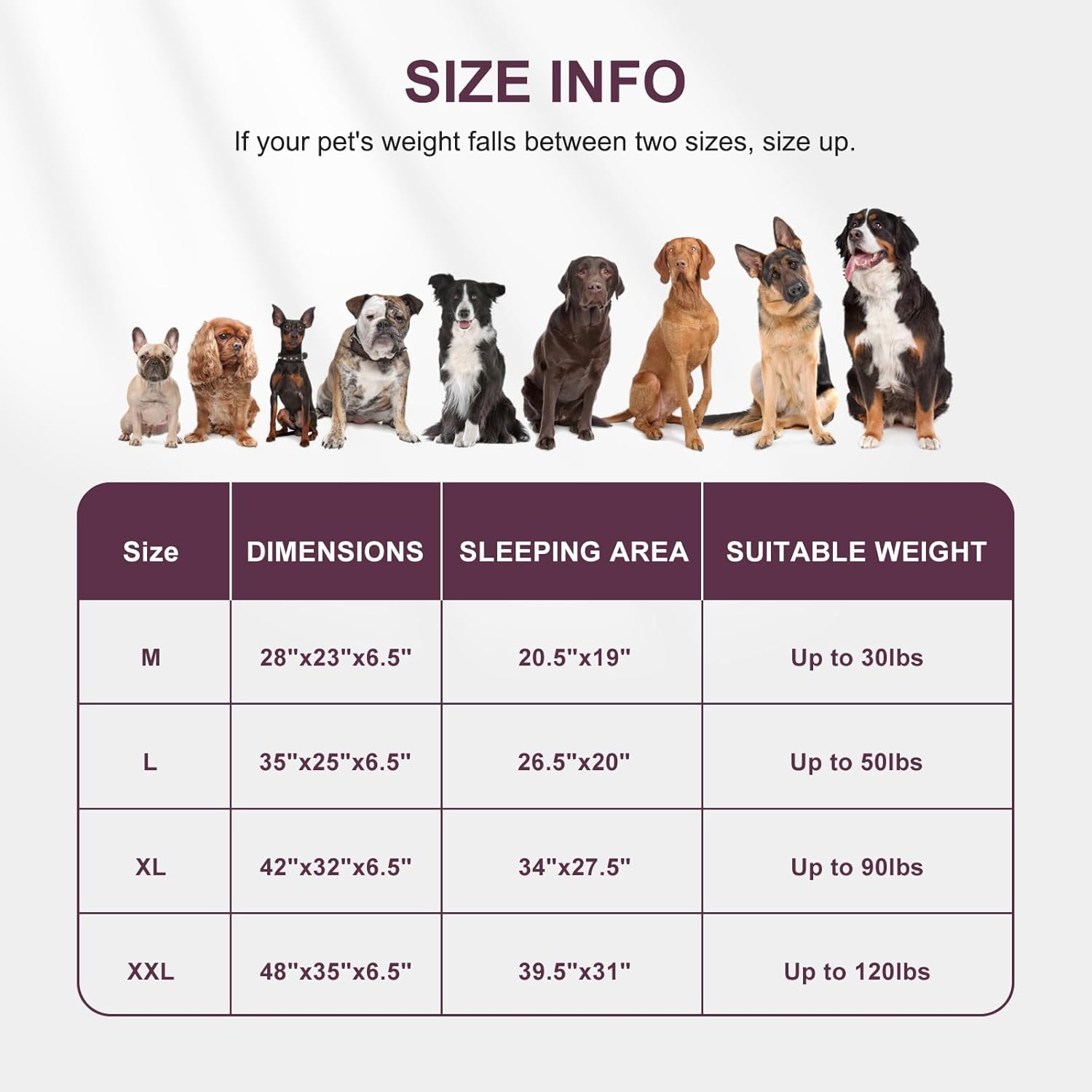 - Multiple Size Options: Orthopedic Dog Bed, Medium, 28" x 23" x 6.5" (3.5" Base Foam Height; Sleep Surface: Approx. 20.5" x 19") For Dogs Up to 30 lbs. Large - 35" x 25" x 6.5" (3.5" Base Foam Height;Sleep Surface: Approx. 26.5" x 20") For Dogs Up to 50 lbs. Extra Large - 42" x 32" x 6.5" (3.5" Base Foam Height;Sleep Surface: Approx. 34" x 27.5") For Dogs Up to 90 lbs.XXL -48" x 35" x 6.5" (3.5" Base Foam Height; Sleep Surface: Approx. 39.5" x 31") For Dogs Up to 120 lbs.