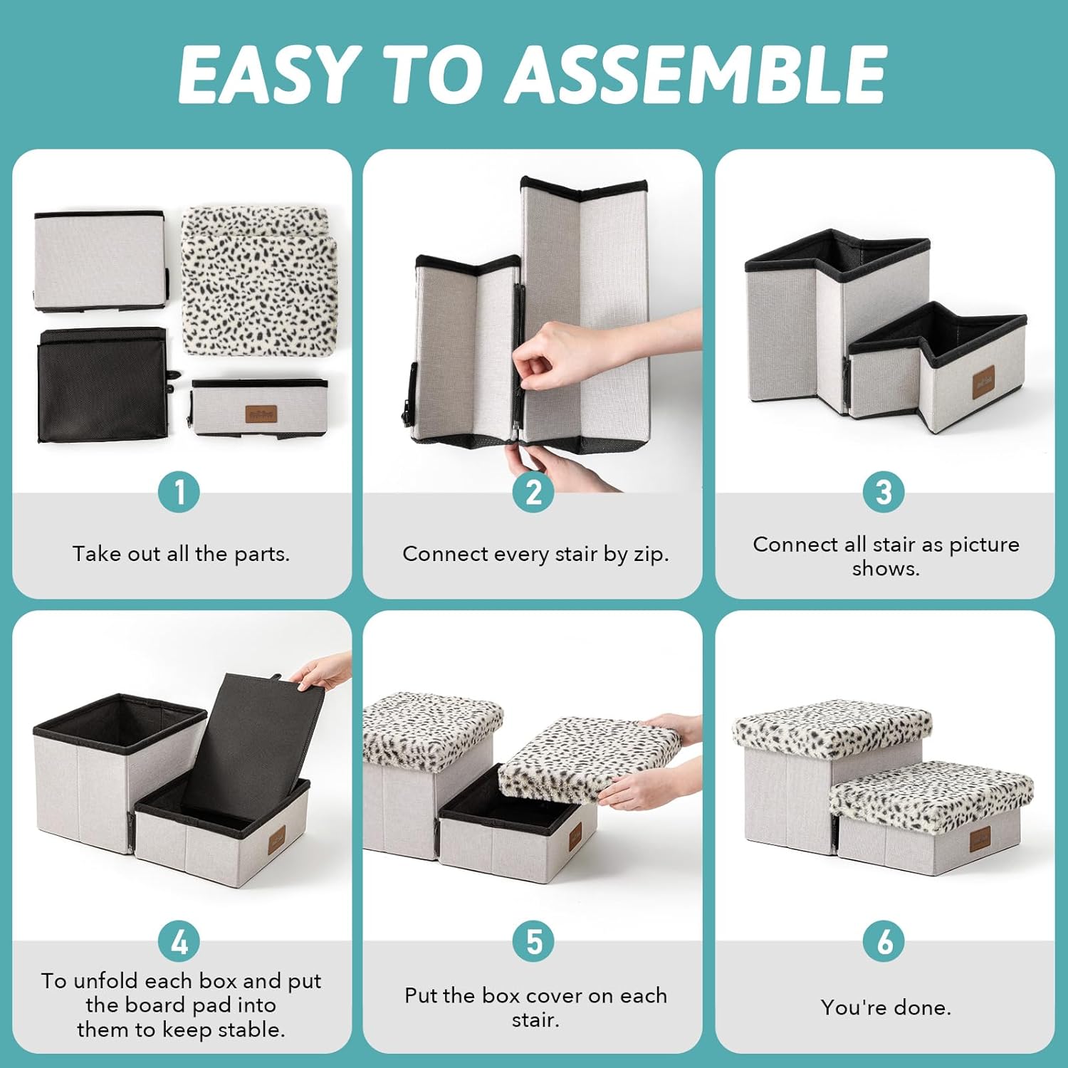 - 【Dog Stairs - Easy to Assemble】First, connect the zipper on each step, then fully unfold each step. Next, place each support board into the corresponding storage box and cover it. When not in use, simply remove the cover and store the stairs after folding them completely. This helps save space, making it ideal for small rooms. You can also watch our installation video in the product description below.