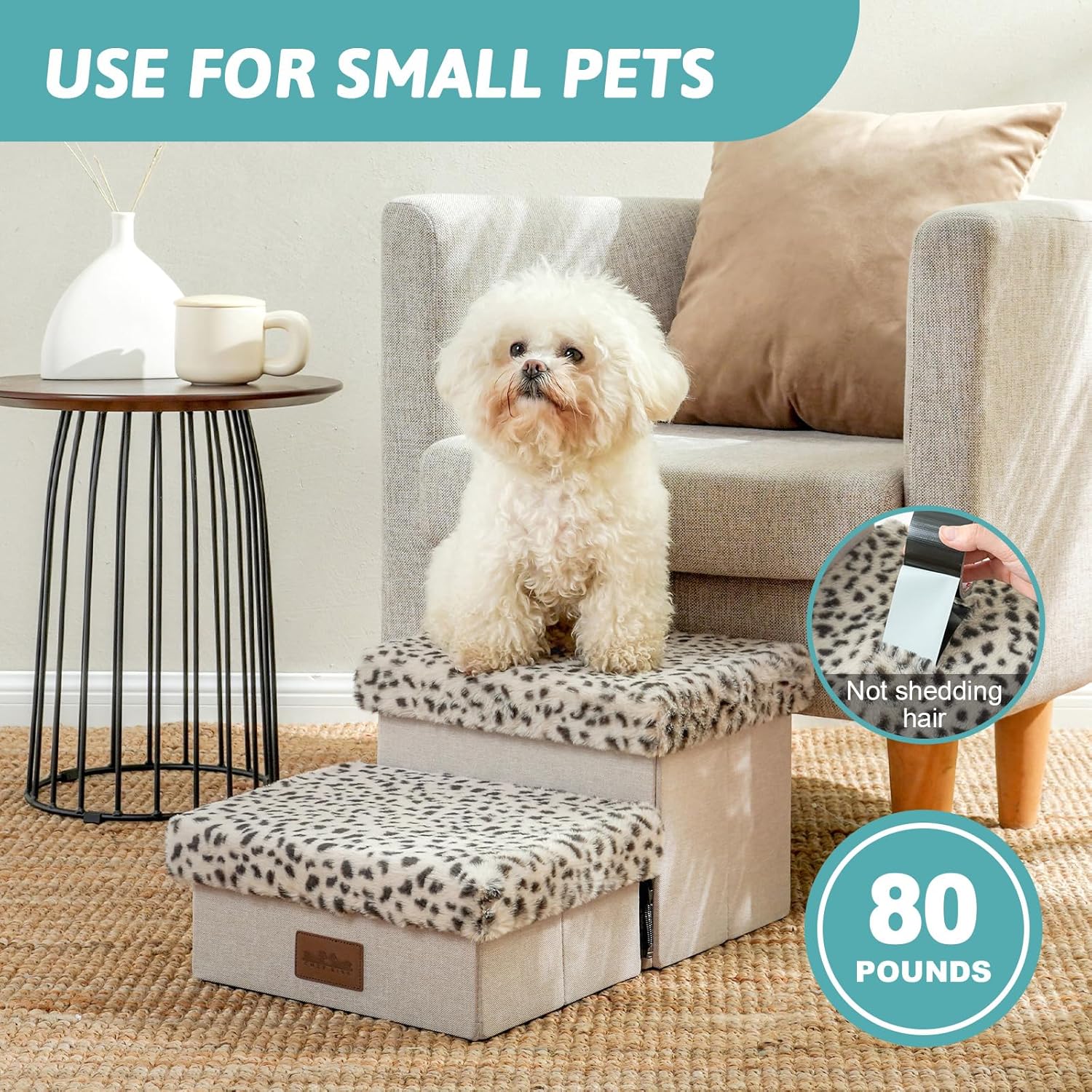 - 【Dog Stair with Storage】NOTE: The stairs are designed for small pets. Each step features a convenient storage space, perfect for storing pet toys, clothes, snacks, and any other pet supplies or accessories. Each step is less than 5 inches high, making it especially suitable for puppies or pets with knee injuries. NOTE: Be sure to verify that the size of the dog stairs is appropriate for your needs before purchasing.