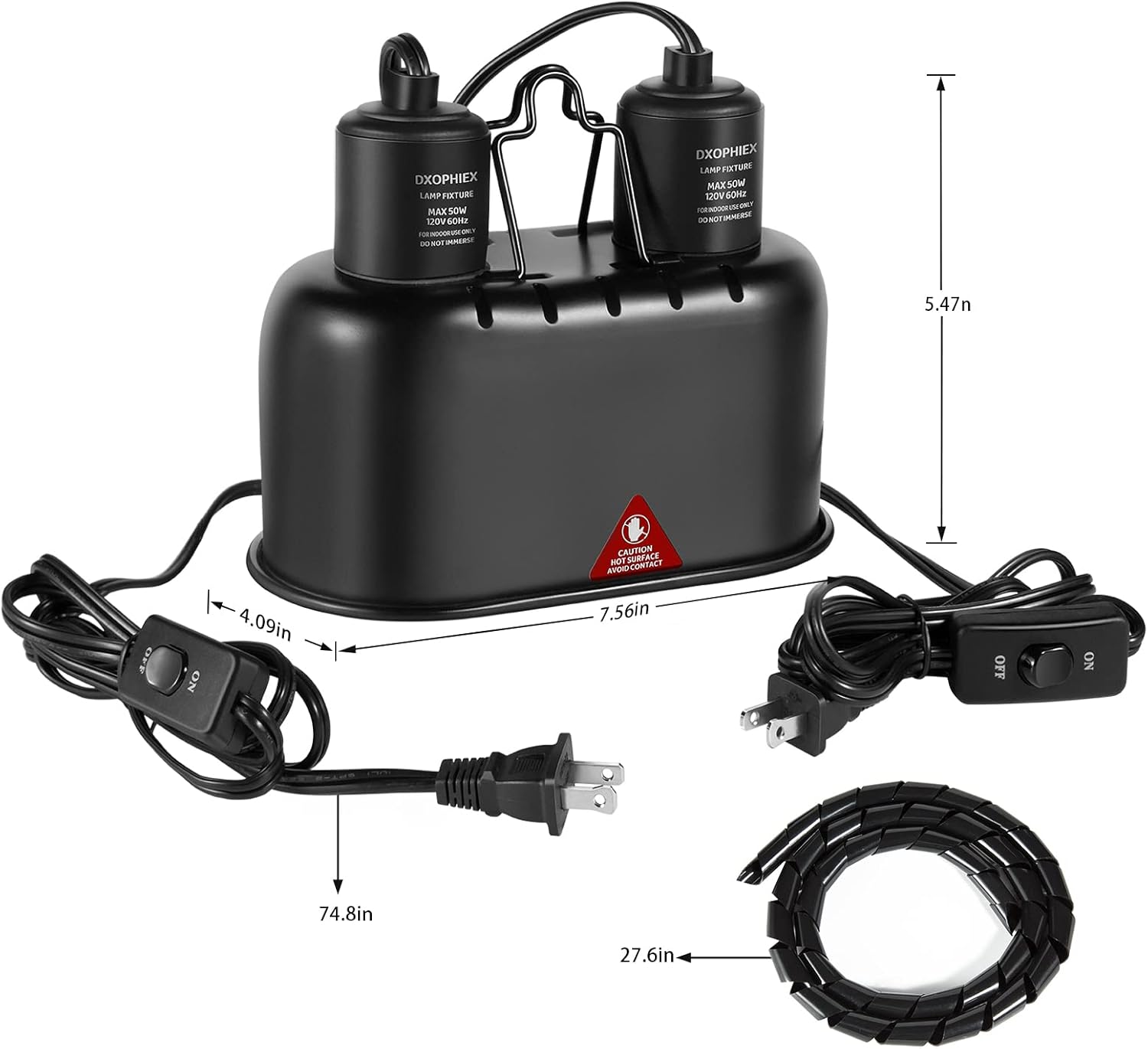 DXOPHIEX Nano Reptile Heat Lamp Fixture, Dual Reptile Light Fixture with 60W Basking Bulb & Infrared Bulb for Bearded Dragon, Turtles, Snake and Lizard Terrarium