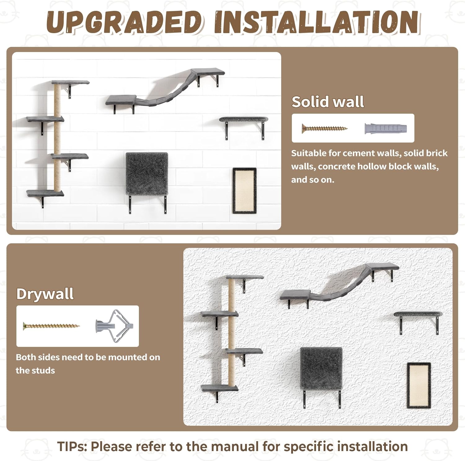 - Stylish and Easy to Install: Our wall-mounted cat shelves feature a sleek, modern design that seamlessly integrates with any home decor. All components are labeled and pre-drilled, accompanied by detailed instructions, making installation quick and hassle-free. You can also customize your cat's activity routes to suit your needs, adding fun to both your and your cat's daily life.