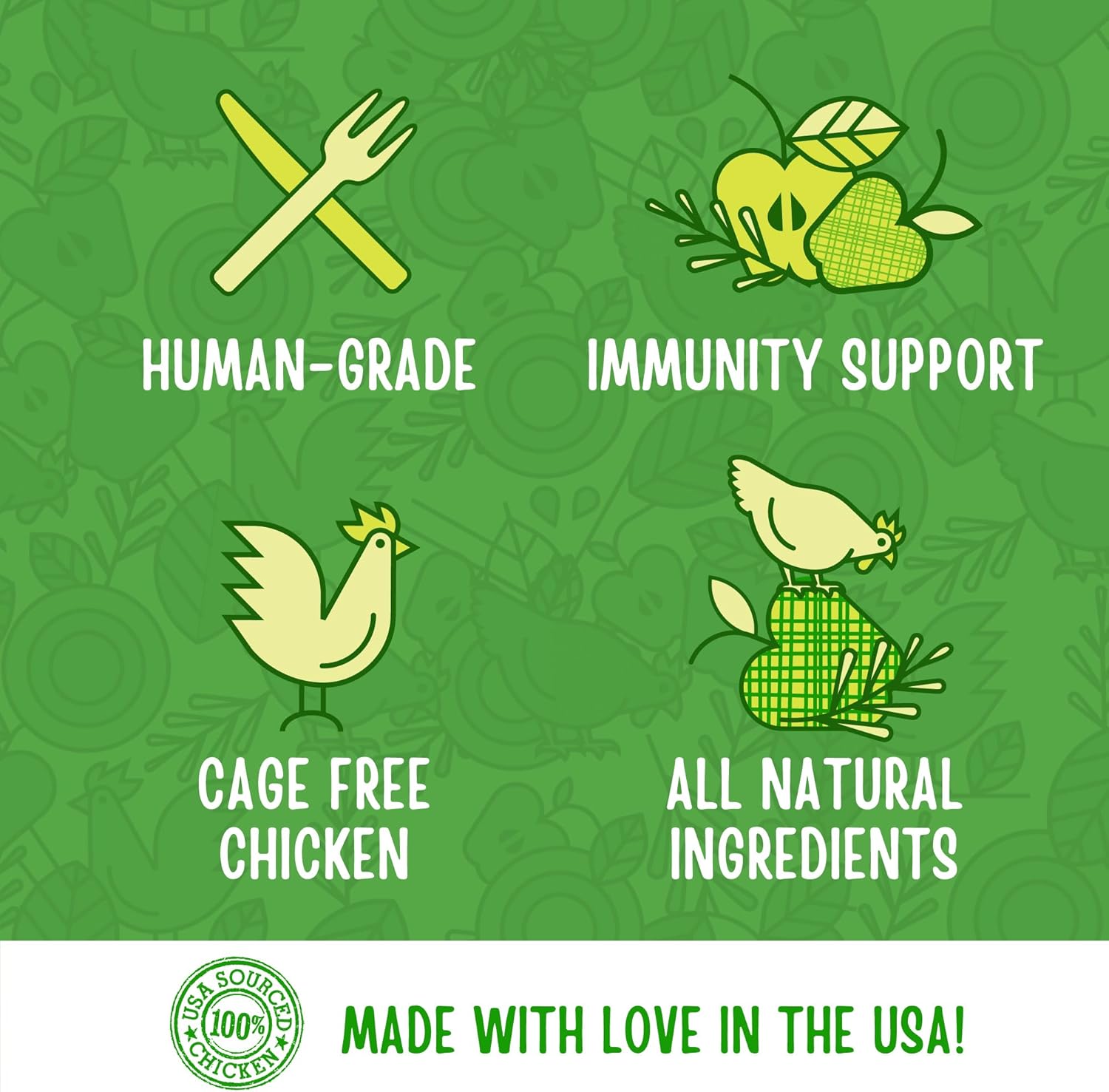 - HUMAN-GRADE: If you wouldn’t eat it, why would you feed it? From the ingredients they’re made with to the kitchens they’re made in, our treats meet strict USDA standards fit for human consumption.