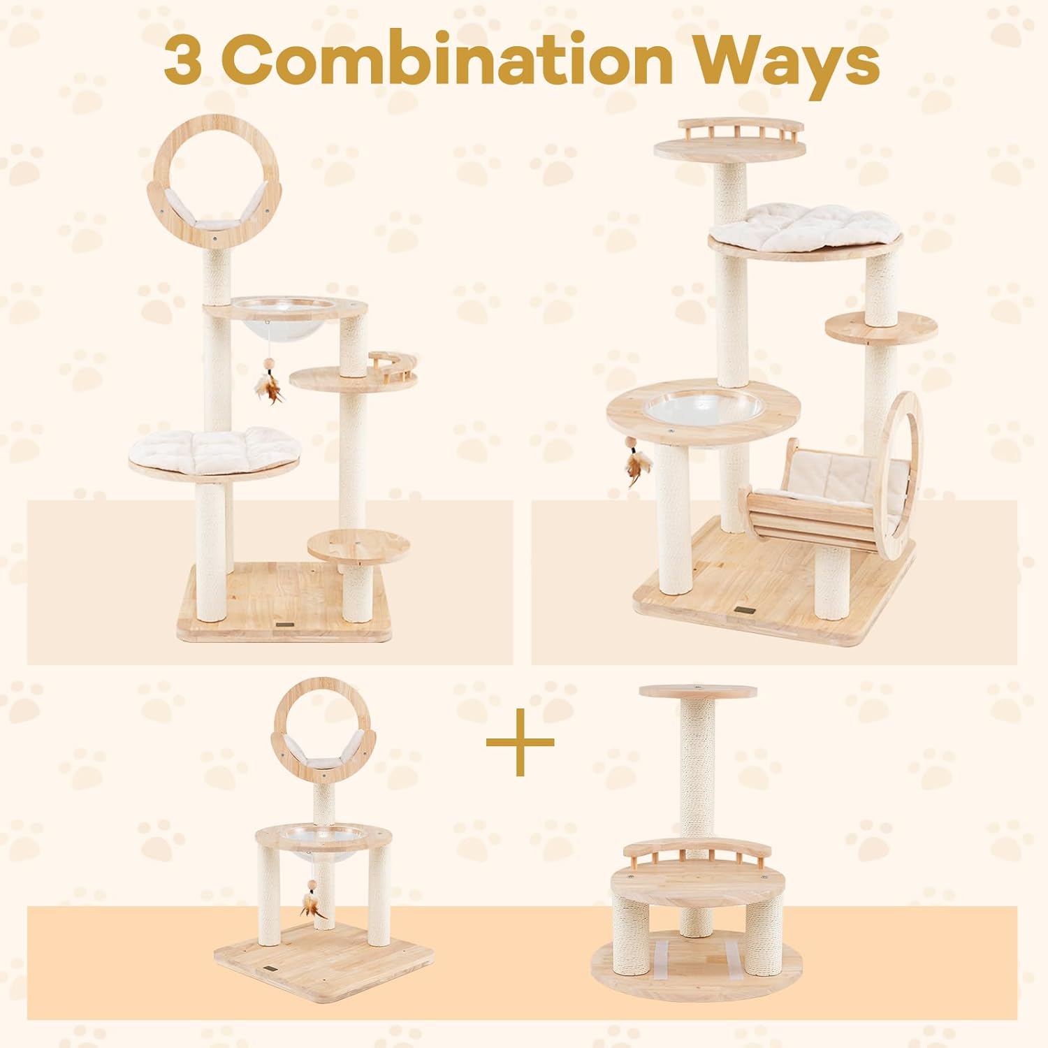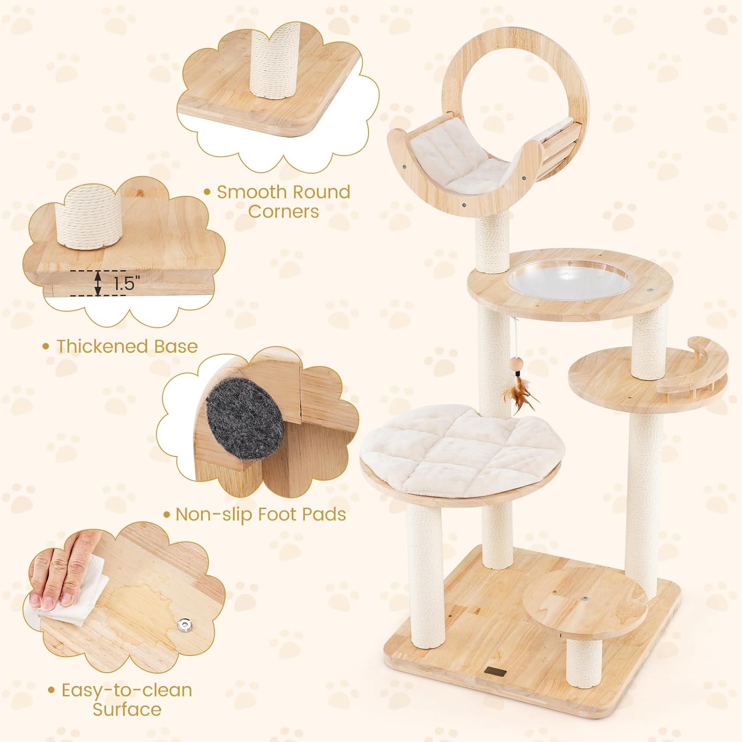 - [Trustworthy Wooden Materials]: Crafted from a blend of premium pine and rubber wood, our cat tower features a sturdy, thickened base for stability. Non-slip foot pads safeguard your floors while smooth, rounded corners ensure a safe play area for your beloved feline friends.