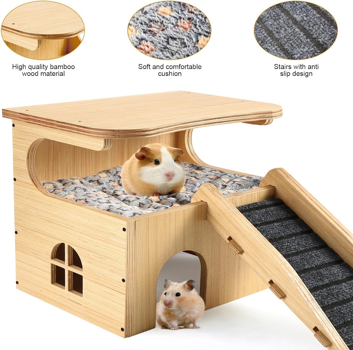 - [Improved Stair and Comfort Features]: Maintaining our signature soft plush mat, the newly designed stairway in our guinea pig wooden house, supported by the thicker wood, offers an even more comfortable and accessible climb. This feature continues to alleviate boredom, reduce stress, and provide an ideal space for rest, play, and relaxation