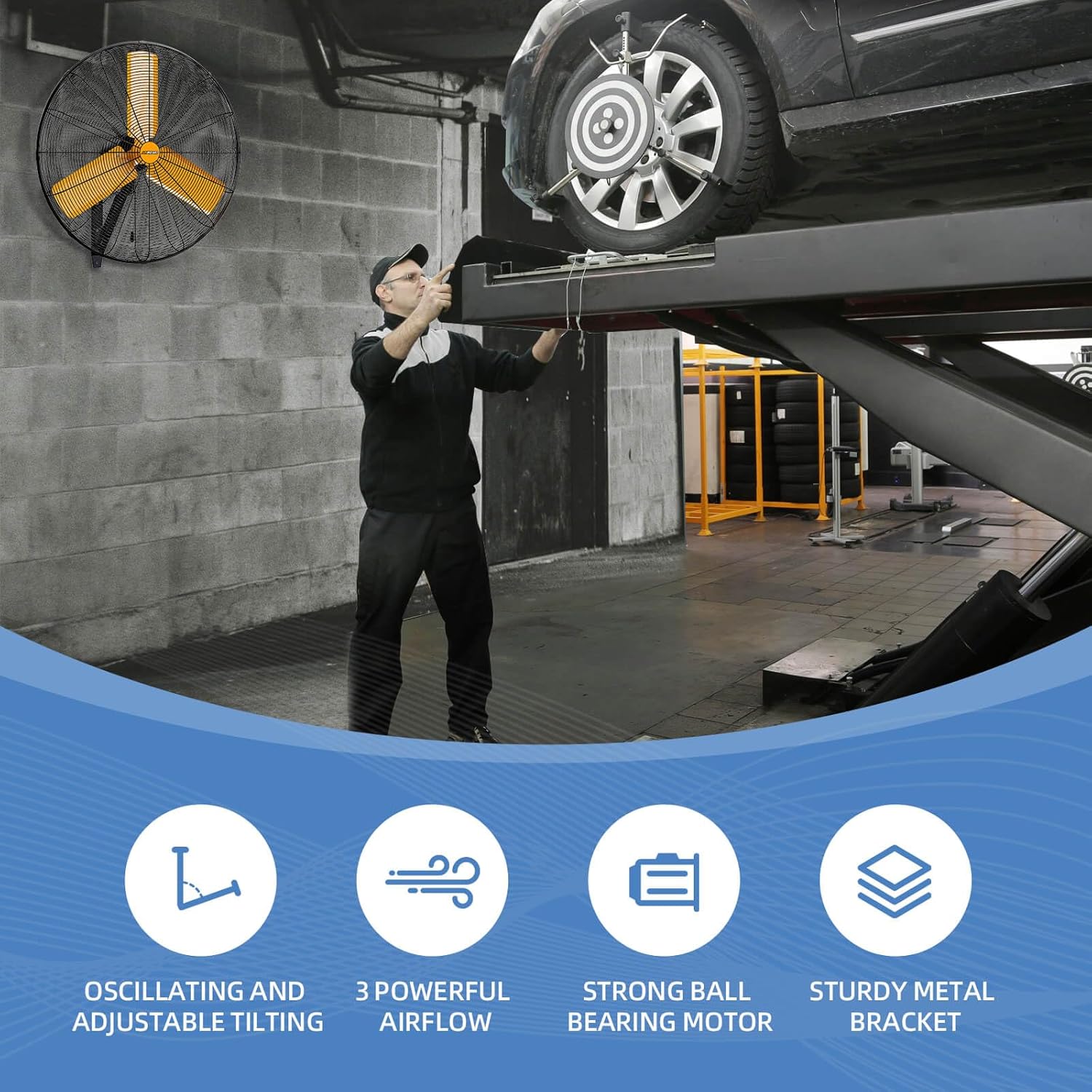 24 inch Oscillating High Velocity Wall Mount Fan, 7600 CFM Industrial Heavy Duty Metal Wall Fan, 3 Speeds, Adjustable Height and Tilt, Commercial Shop Fans for Garage, Workshop