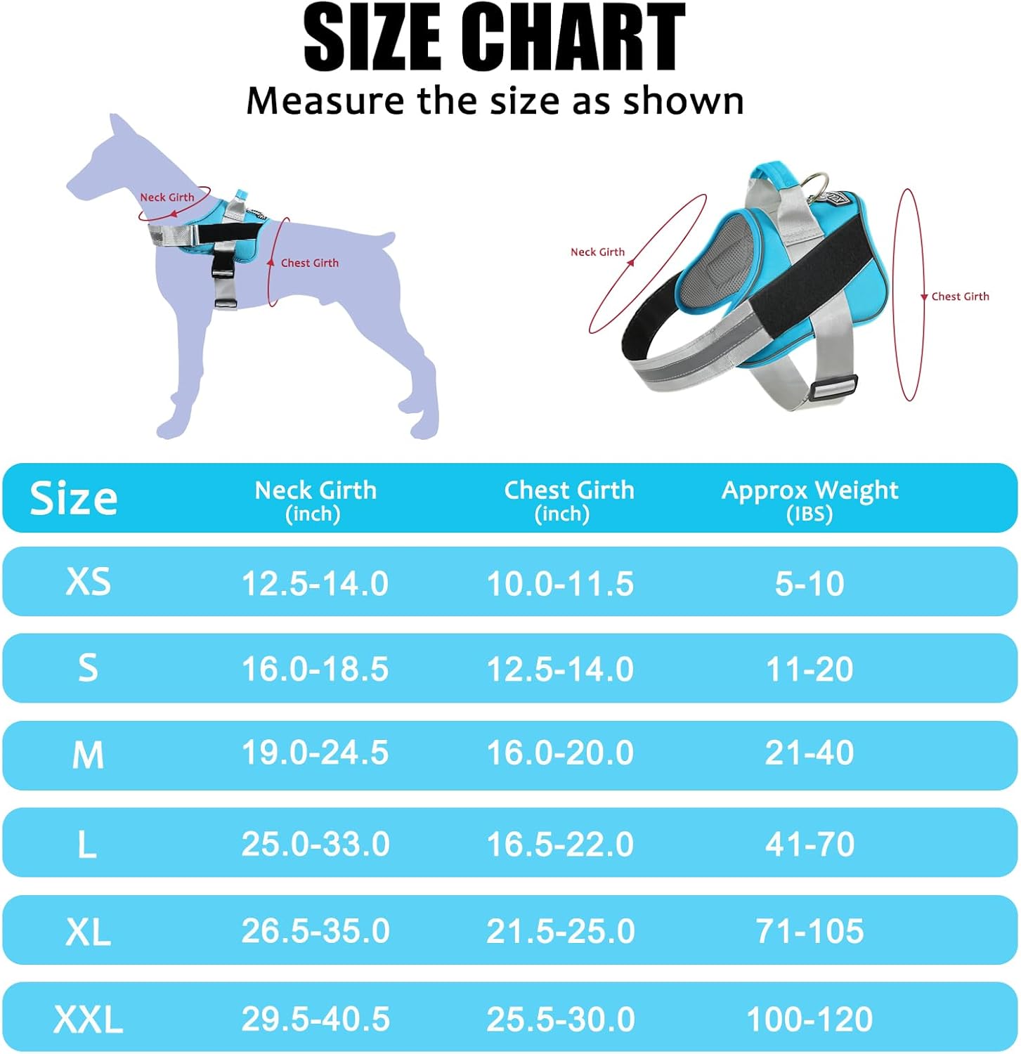 - EXTRA SMALL DOG HARNESS: ★Approx Weight: 5-10 lbs. Neck Girth: 10"-11.5", Chest Girth: 12.5"-14"★. It perfect for extra small dogs and pups, like Yorkie, Chihuahua, Pug, Maltese dog, etc.