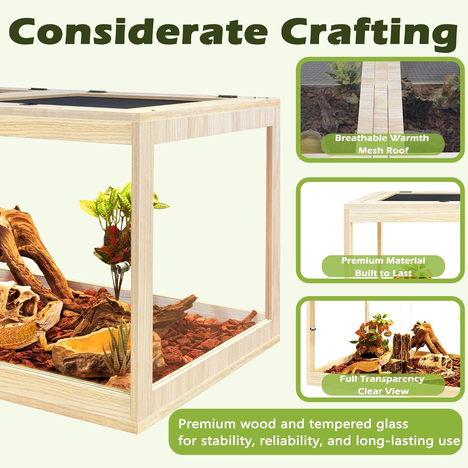 - 【Premium Wooden Reptile Habitat】Give your reptiles a safe and dependable home. Crafted from solid wood with a water-repellent polyester coating, this enclosure is built to last while maintaining a dry and stable environment. Specially designed for terrestrial reptiles (not for aquatic species), it provides a reliable space where your pet can thrive every day.