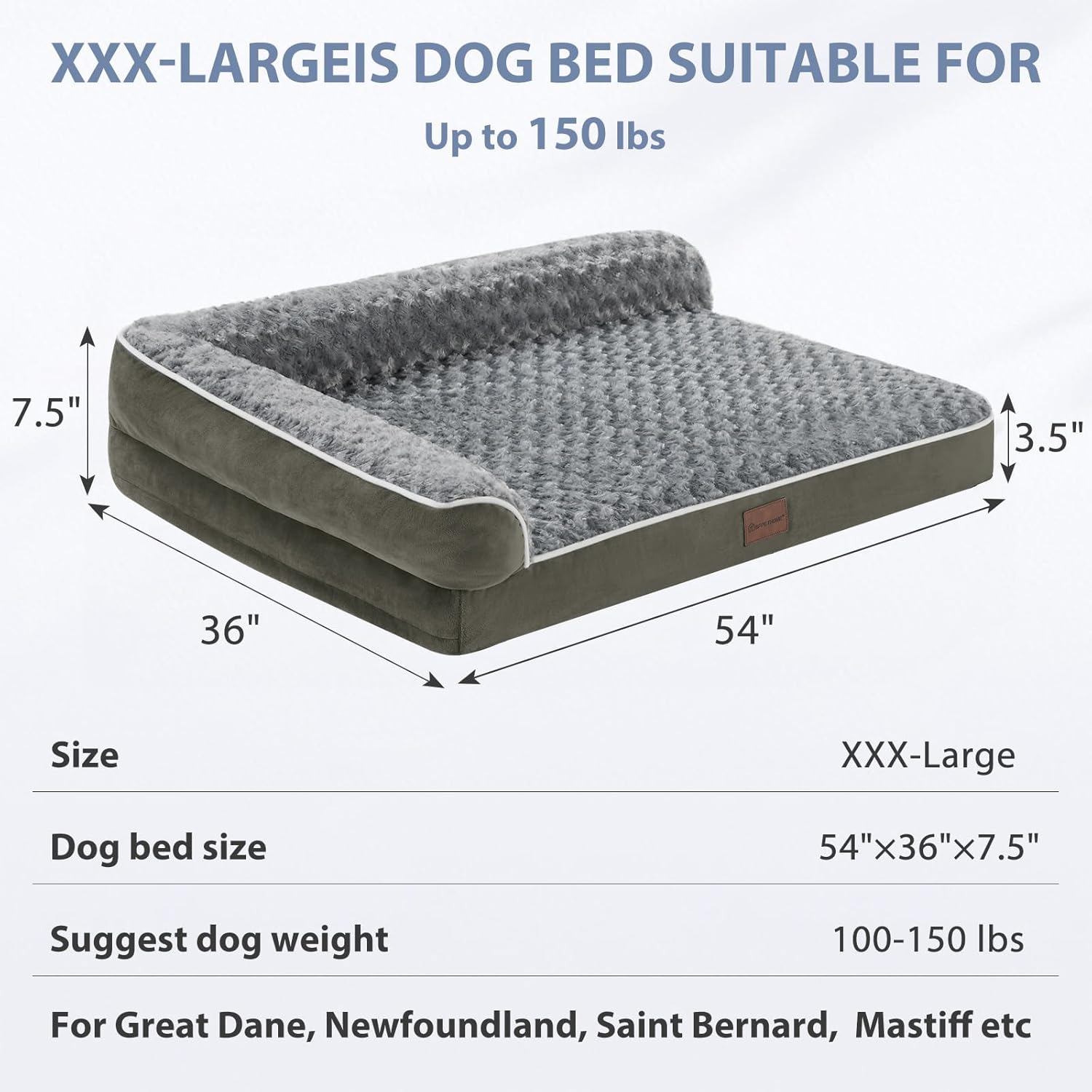 • SIZE(DOG BEDS FOR EXTRA DOGS): The dimensions of this XXL+ dog bed are 54“ x 36" x 7.5". XXL+ dog beds for extra large dogs up to 150 lbs. This orthopedic dog couch will give your pet more space and allow your friend to stretch out on the bed.