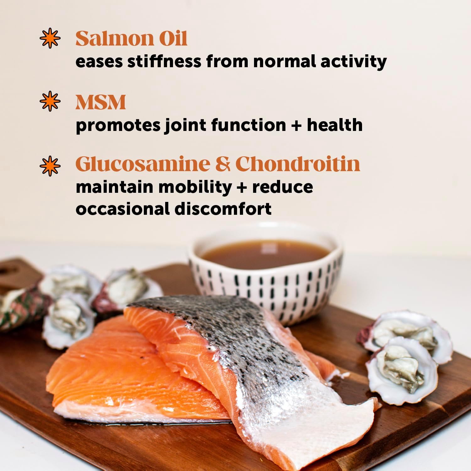 - Made with Natural Ingredients Like Salmon Oil, Glucosamine + Chondroitin, & More: For your pup’s wellness, we use natural ingredients that truly work. Omega-rich salmon oil enhances mobility, while glucosamine and chondroitin support joint health and flexibility. MSM aids in joint function, and fish oil benefits joints, skin, brain, heart, and overall health. Collagen-rich bone broth adds a protein boost.