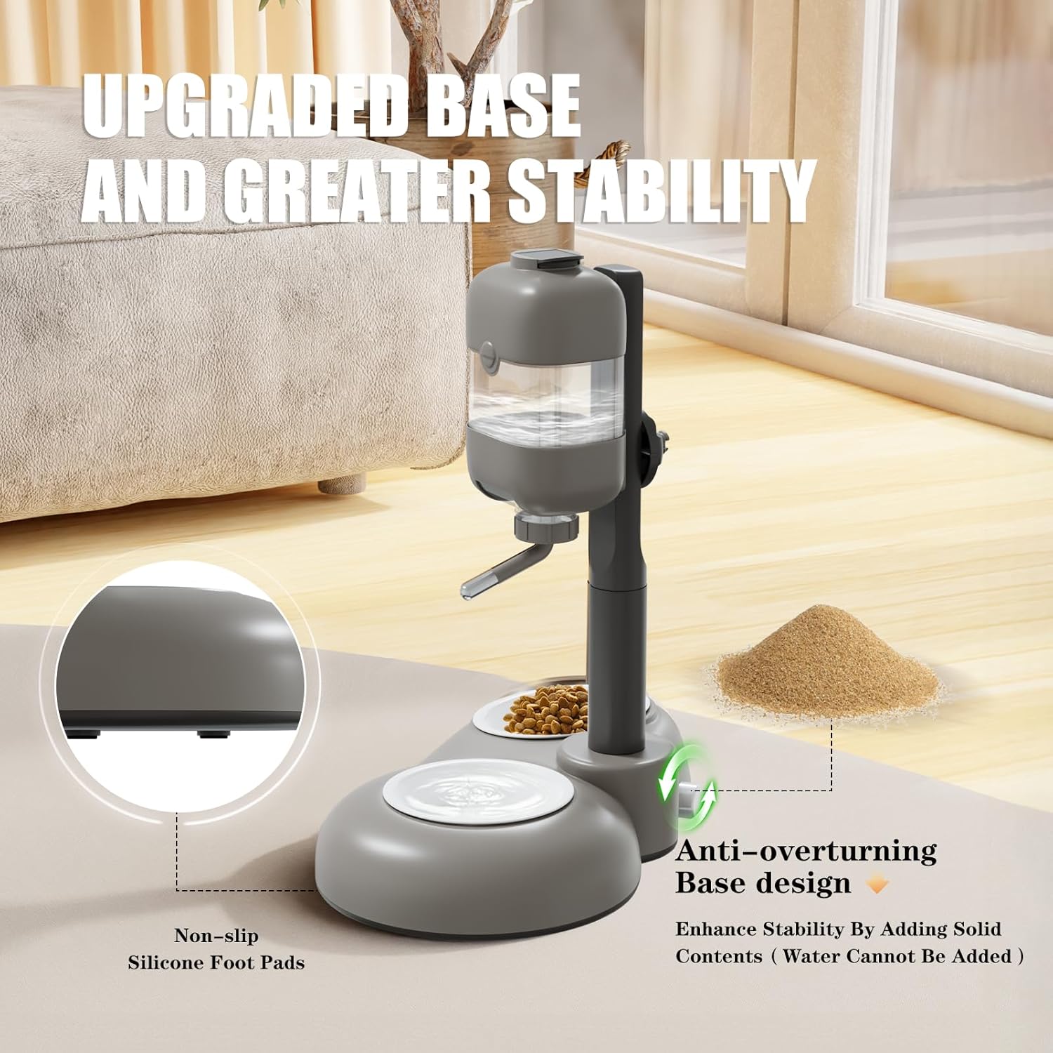 - 【Anti-overturning Base】In order to solve the pain point that the vertical water dispenser is easy to be overturned by pets,MITOCAPY conducted a series of experiments and finally designed this anti-overturning pet water dispenser.With these non-slip silicone foot pads on the bottom of the base,MITOCAPY dog water bottle dispenser has a greater stability than normal vertical water dispenser.Even you could also enhance much more stability by adding solid contents into the base,such as sand, pebbles and so on.