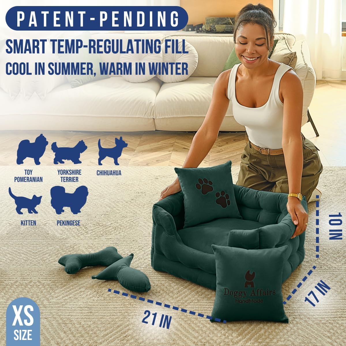 - JOINT SUPPORT COMFORT & TEMP REGULATION: Premium cushioning supports joints, hips, and growing bones, while smart fill keeps her cool in summer and warm in winter. The only calming dog bed that truly hugs her back like your arms.