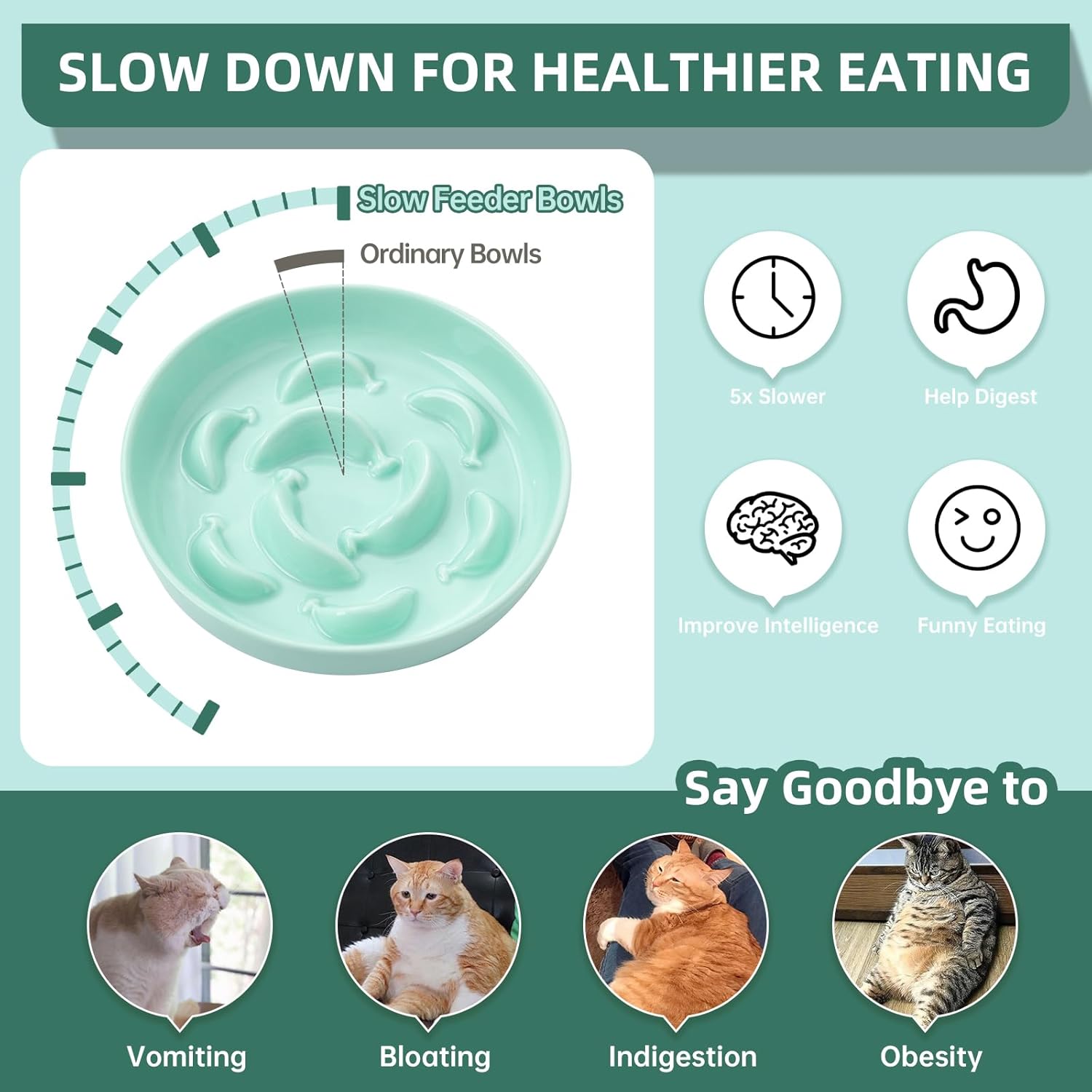 - Good Eating Habits Start Right Now - The slow feeder cat bowl is designed with multiple raised banana shaped obstacles that can effectively increases the difficulty of eating and change your cat's overeating behavior, reduce bloating and vomiting.