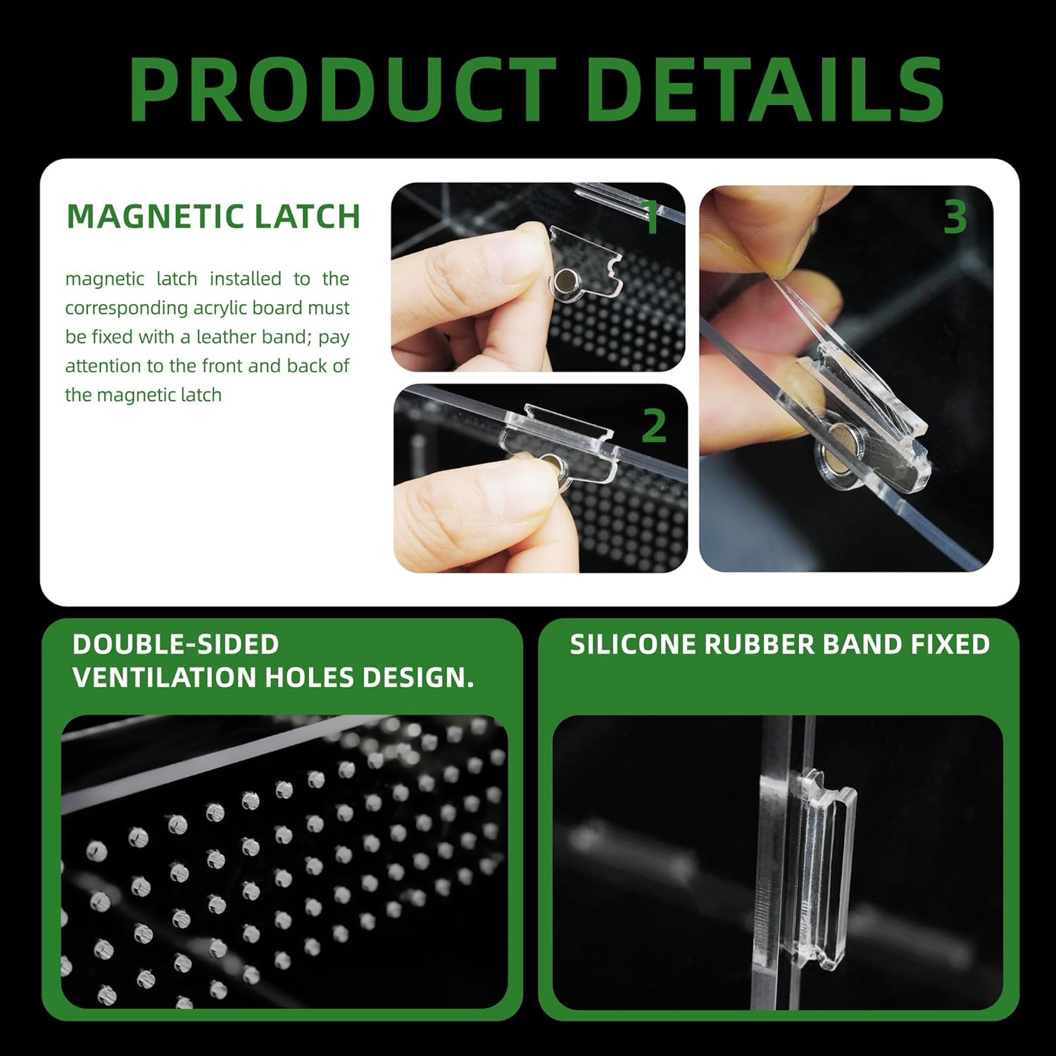 - 360 Degree View: 4x4x8 Inch large acrylic reptile enclosure is all-round transparent, it's convenient to observe your slithery friends in the terrariums and feed them in time. The magnetic lock design, easy to open and close.
