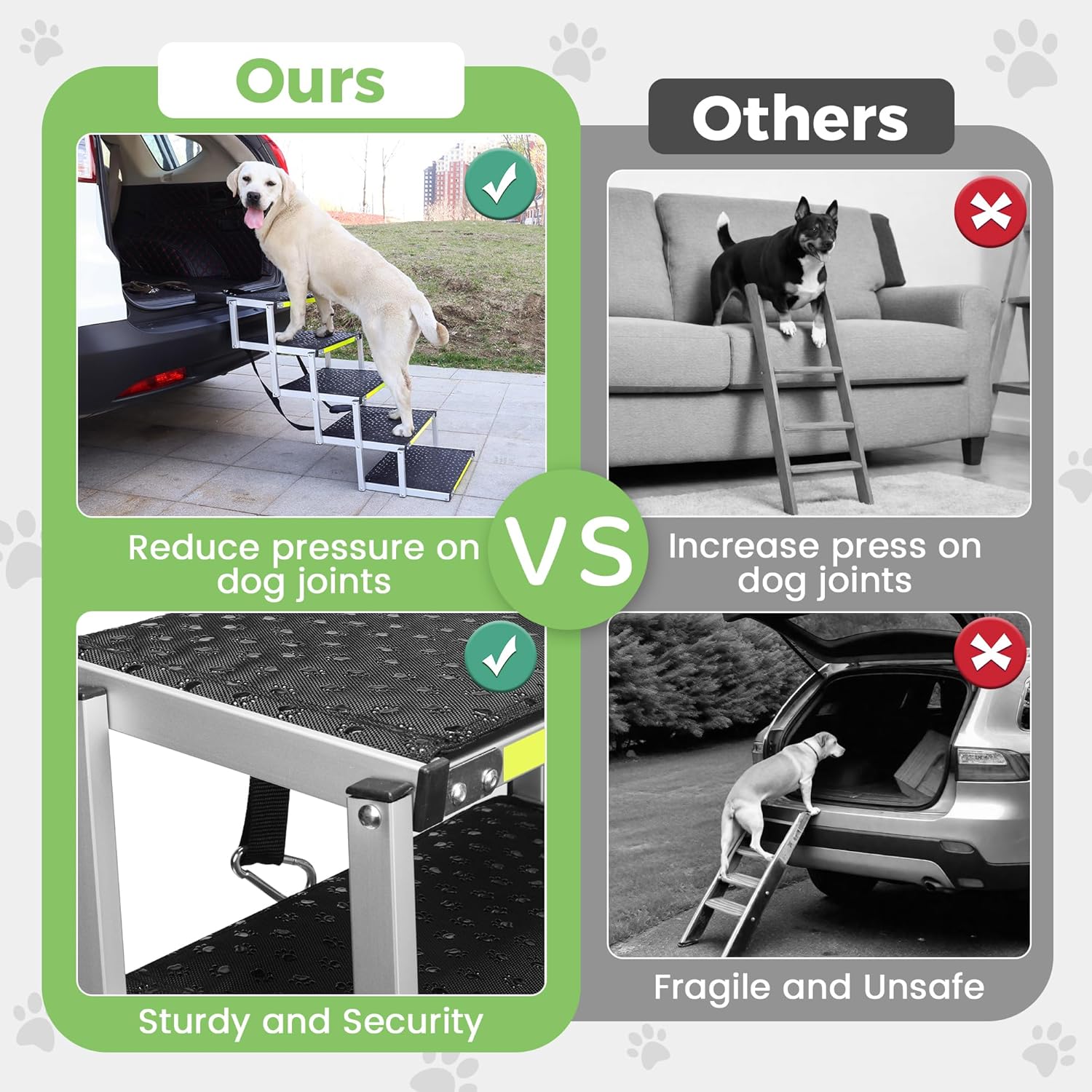 - Robust Build Quality: Constructed with a sturdy aluminum frame and reinforced with high-density boards, our ramp supports pets up to 200 lbs, ensuring durability and longevity for small to large breeds.