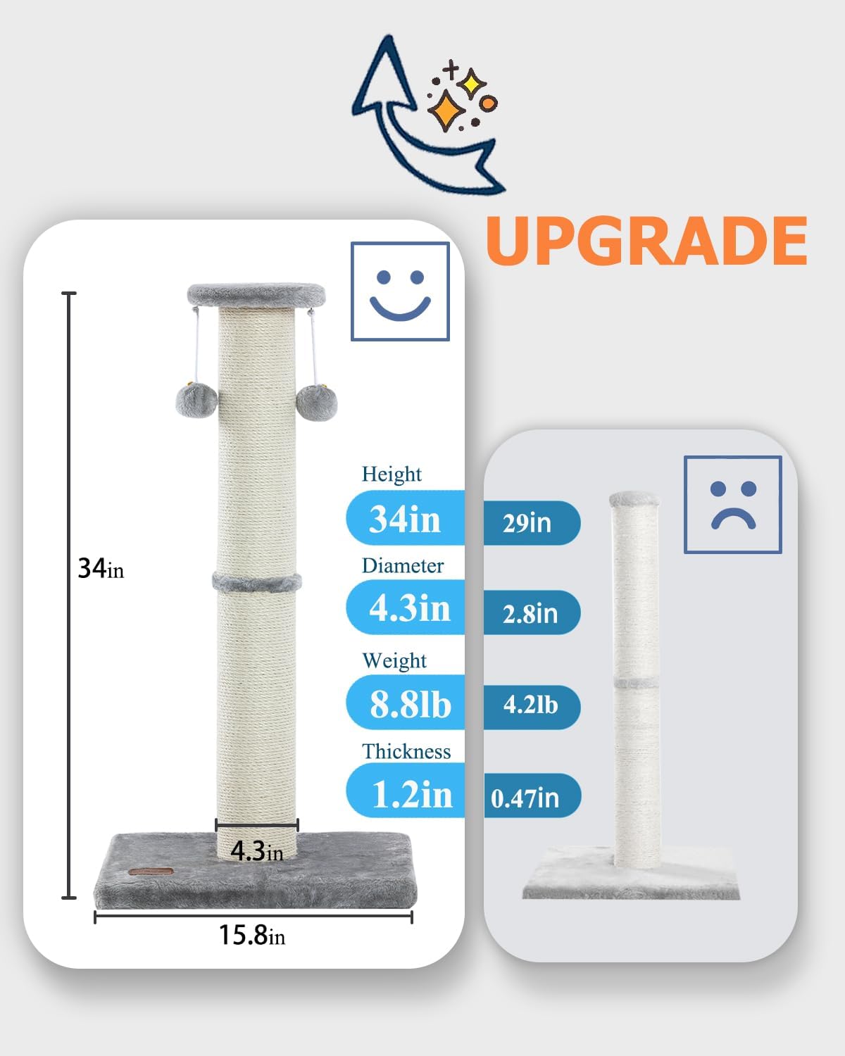 Kilodor 34Inch Tall Cat Scratching Post,4.3Inch Diameter Large Sisal Cat Scratch Post with Ball, Sturdy and Durable Cat Scratcher for Indoor Cats Adults Grey