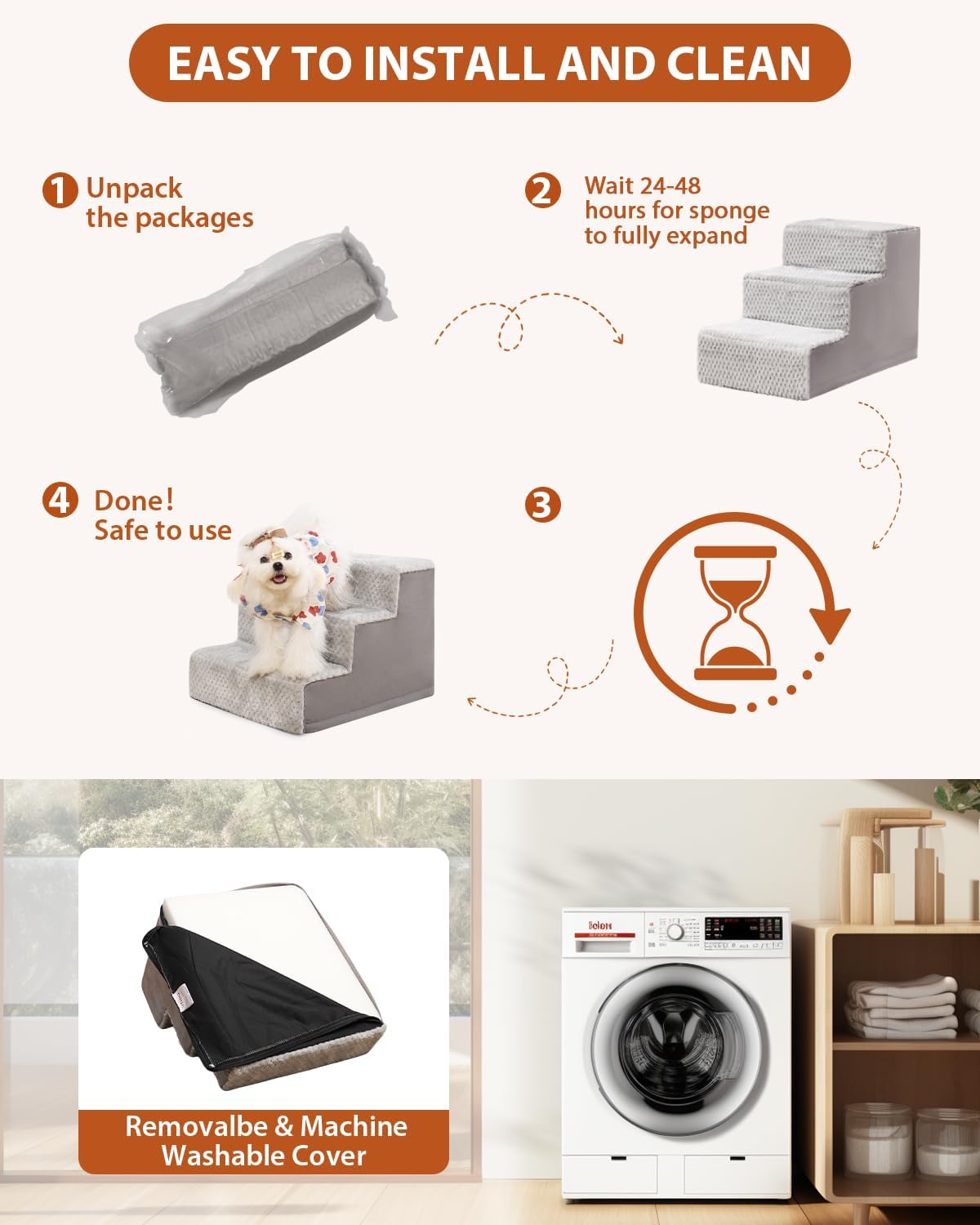 - 【INSTALL AND CLEAN】Our pet stairs are vacuum-packed and require installation.Please follow instruction manual or video. Let foam fully expand for 24-48 hours before use.The outer cover has a smooth zip for easy removal of foam core and fiberboard. Do not machine wash or dry the foam core.