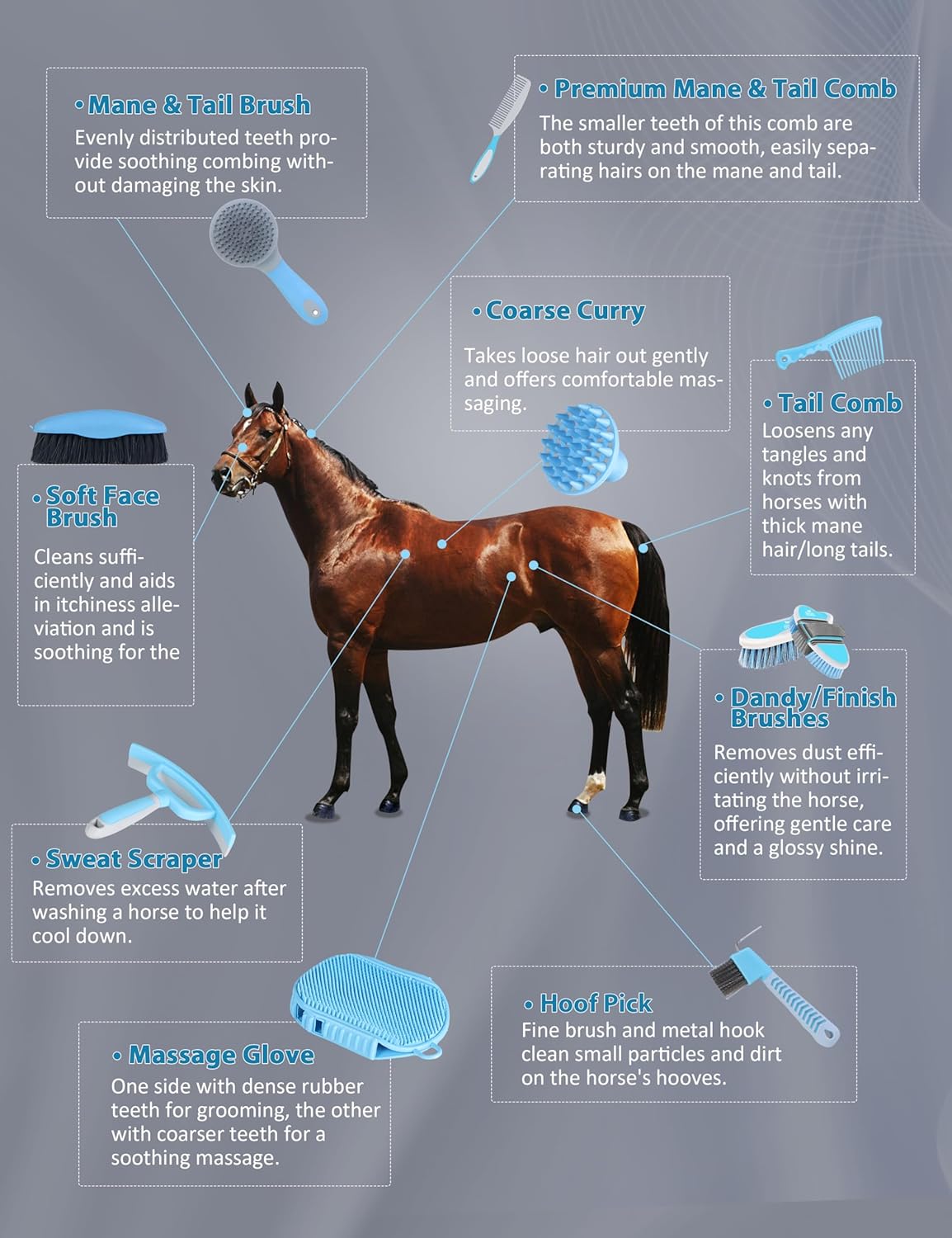 Harrison Howard Horse Grooming Kit 11-Piece Equine Care Series Horse Brush Sets with Organizer Tote Bag Tack Room Supplies Shedding Grooming Massaging Tools Blue Brushstroke Ponies