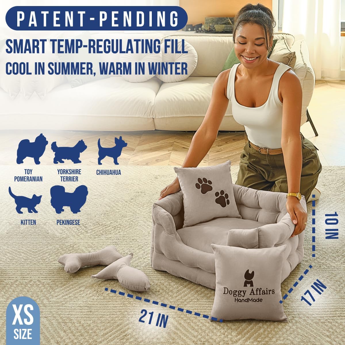 - JOINT SUPPORT COMFORT & TEMP REGULATION: Premium cushioning supports joints, hips, and growing bones, while smart fill keeps her cool in summer and warm in winter. The only calming dog bed that truly hugs her back like your arms.
