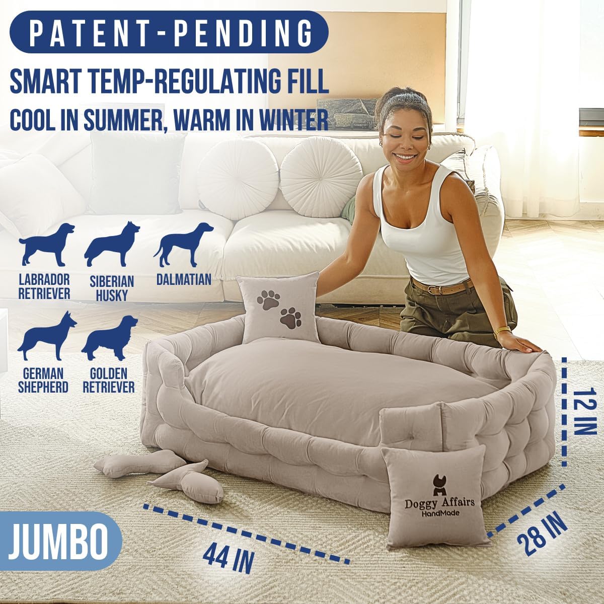 - JOINT SUPPORT COMFORT & TEMP REGULATION: Premium cushioning supports joints, hips, and growing bones, while smart fill keeps her cool in summer and warm in winter. The only calming dog bed that truly hugs her back like your arms.
