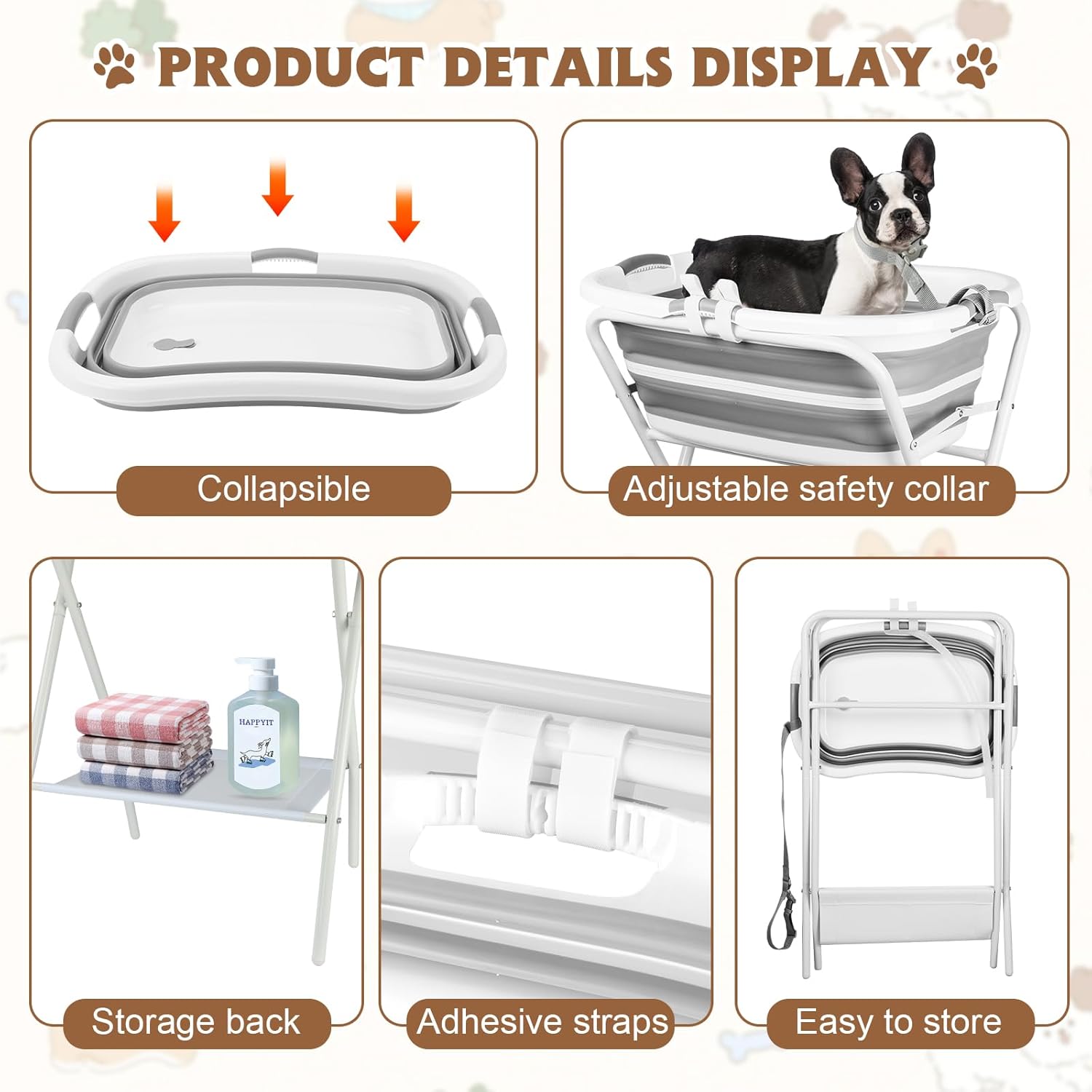 - Collapsible dog bathtub: The puppy bath tub comes with installation instructions, follow the steps to assemble the support, tie the collar on the edge of the tub, twist the drain device at the bottom of the tub, and you can use it; It comes with adhesive straps that allow you to close the stand when not in use and attach the tub to the stand with the straps and lean it against the wall