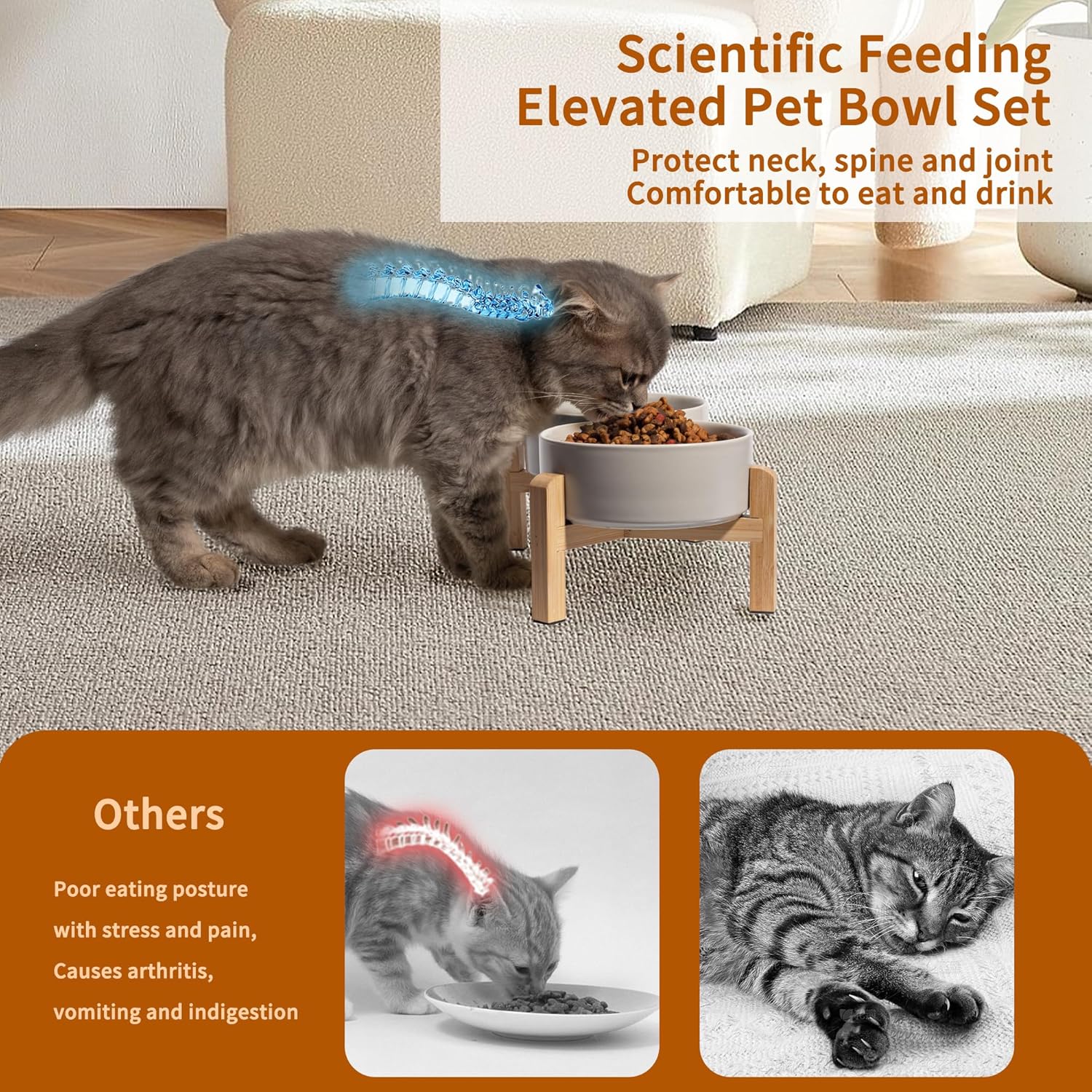 Elevated Ceramic Dog Bowl Set - Raised Feeding Bowls with Non-Slip Bamboo Stand - Small Pet Dishes for Food and Water - Ideal for Cats and Puppies - 16.23 OZ - 2 Cups - 480 ML