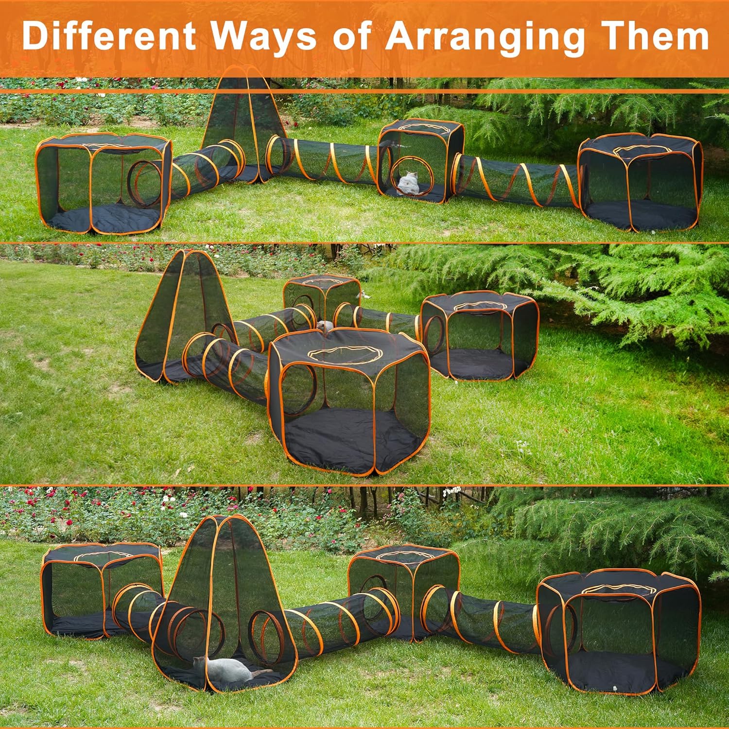 7 in 1 Outdoor Cat Enclosure, Foldable Pop-Up Mesh Playpen Tunnel for Pet Run, Foldable Outside Enclosed Tent Cage for Small Dogs, Rabbit and Other Animals