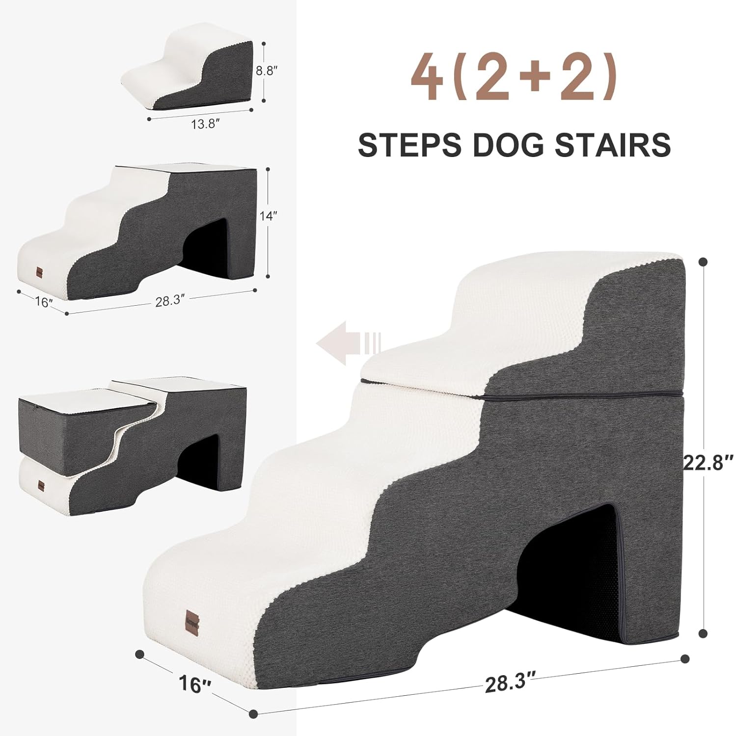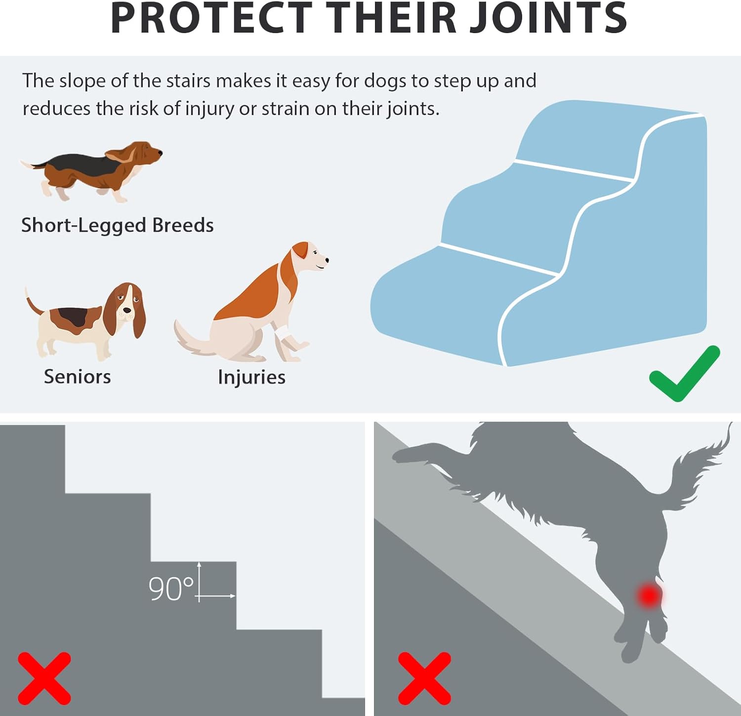 - MULTIPLE STEP SIZES - This pet stair has 3 steps, 4 steps and 5 steps to choose. Our 3-step stairs fit chair/sofa/bed up to 20inch. 4-step stairs fit chair/sofa/bed up to 24inch. And 5-step stairs with a hole for pets to play fit chair/sofa/bed up to 28inch.
