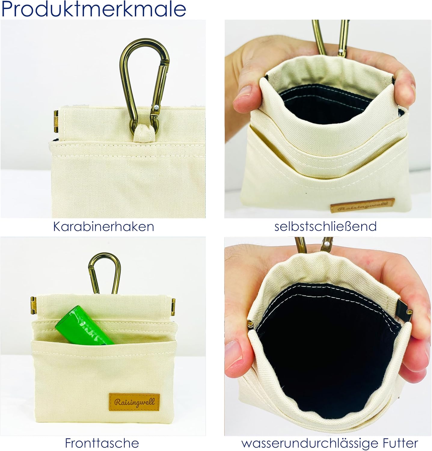 - Durable Material: Raisingwell's dog treat training pouch is crafted from durable, washable, non-toxic vegan fabric, made of pure cotton. In particular, the waterproof lining addresses the issue of difficult cleaning inside the training pouch.